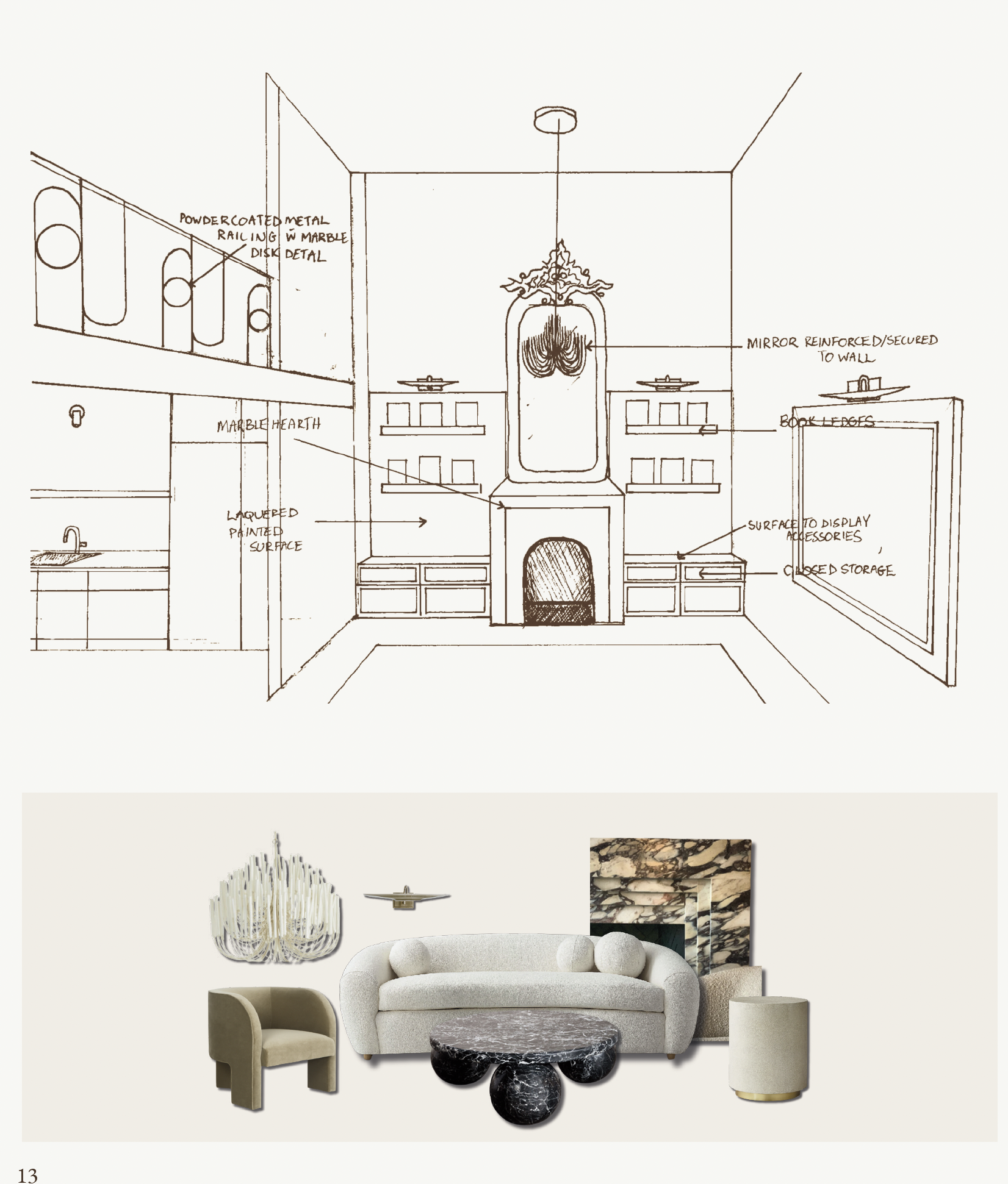 attaching hand sketch and furniture and material moldboard please render contemporary space in soft light