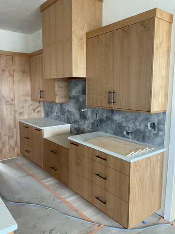 do not change the cabinets in any way preserve the exact cabinet colors materials finishes dimensions door and drawer styles hardware spacing alignment and all geometry exactly as shown do not alter the countertop shape backsplash appliances flooring lighting fixtures or wall structure only remove the construction materials clutter and mess from the scene clean the room and make it look finished and staged add a few simple tasteful home accessories appropriate for the style of the space but do not add or remove any furniture windows or architectural elements maintain the original lighting direction and realism enhance clarity and polish the photo while keeping the cabinetry and room design completely unchanged do not alter the lighting to keep the cabinet colors as they are in the image add new flooring put a range top below the hood do not change the cabinet color at all stage the countertops for a kitchen