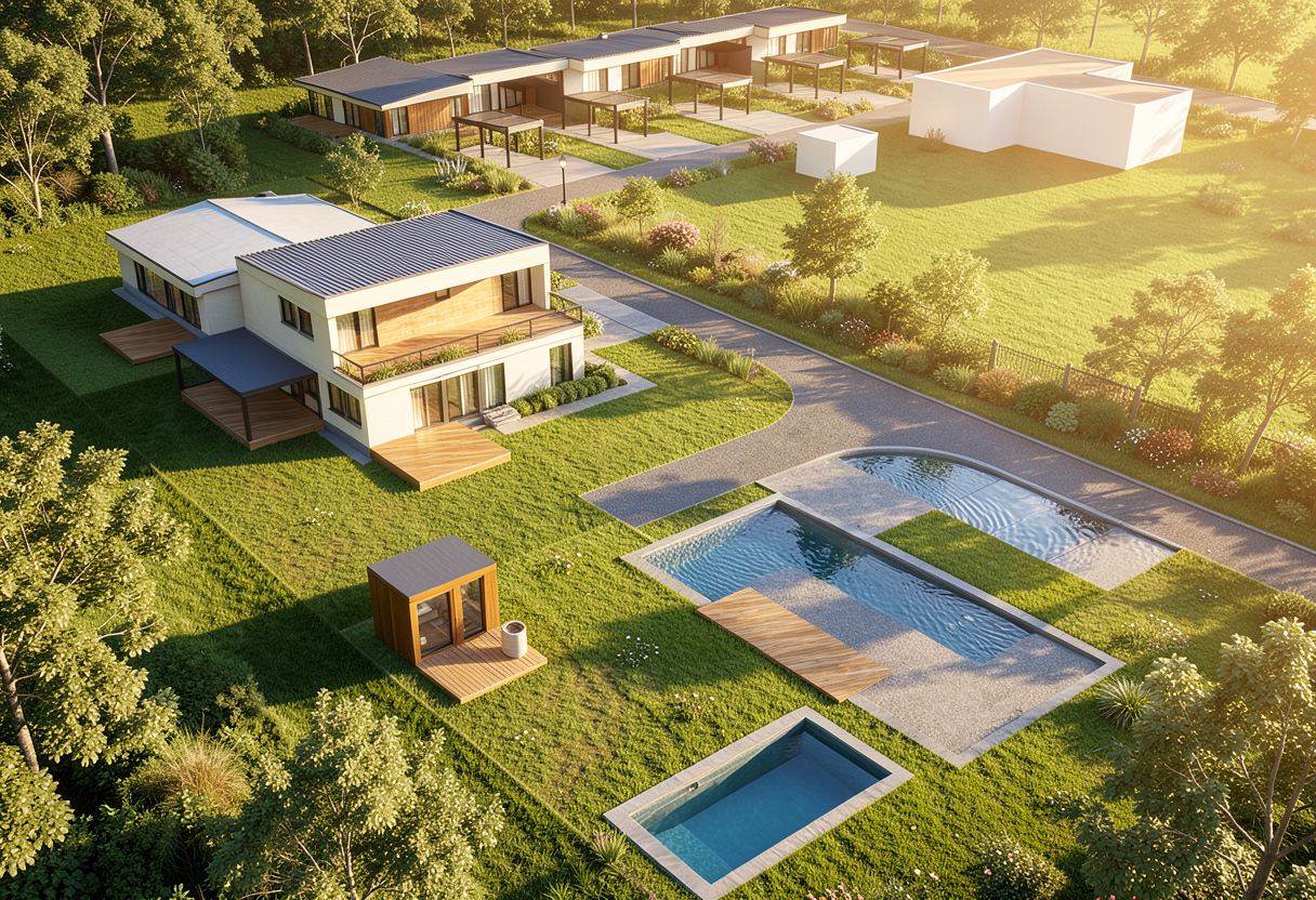 white window trims large timber frame aesthetics add a cupola and some landscaping make realistic make siding board and batten pine move cupola to peak of roof line driveway along front of house off the porch 2 car garage on left side no garage doors on this front side this is an old bank barn we are converting to a residence remove all vehicles and buildings from background add a large dormer on the front