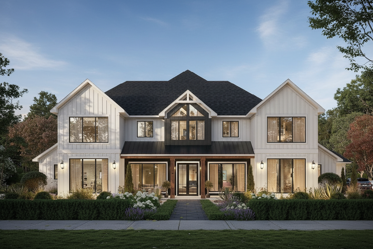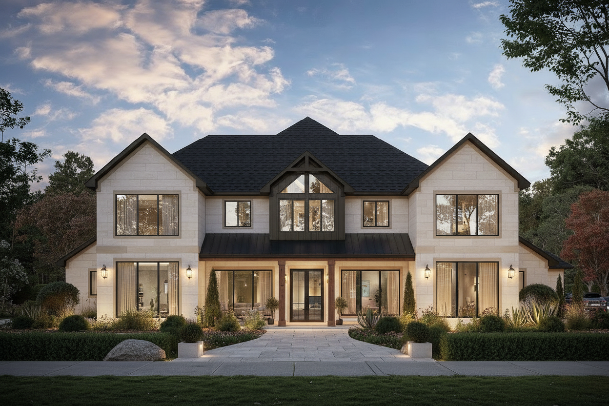 change exterior to a transitional modern organic style do not change the structure
