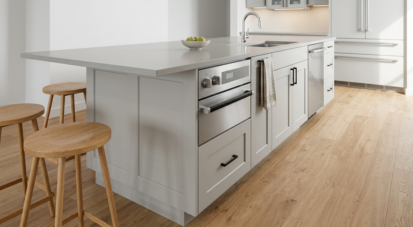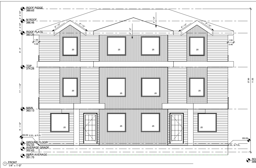 render a modern three story house with gray horizontal siding incorporate large windows reflecting a serene sky the roof is a sleek dark charcoal with subtle metallic sheens add warm inviting lighting from inside visible through the windows include a welcoming front door in deep mahogany with glossy finish surround the house with vibrant green grass and a few blossoming trees create a tranquil atmosphere with a golden sunset in the background casting soft shadows enhancing the elegant contemporary vibe