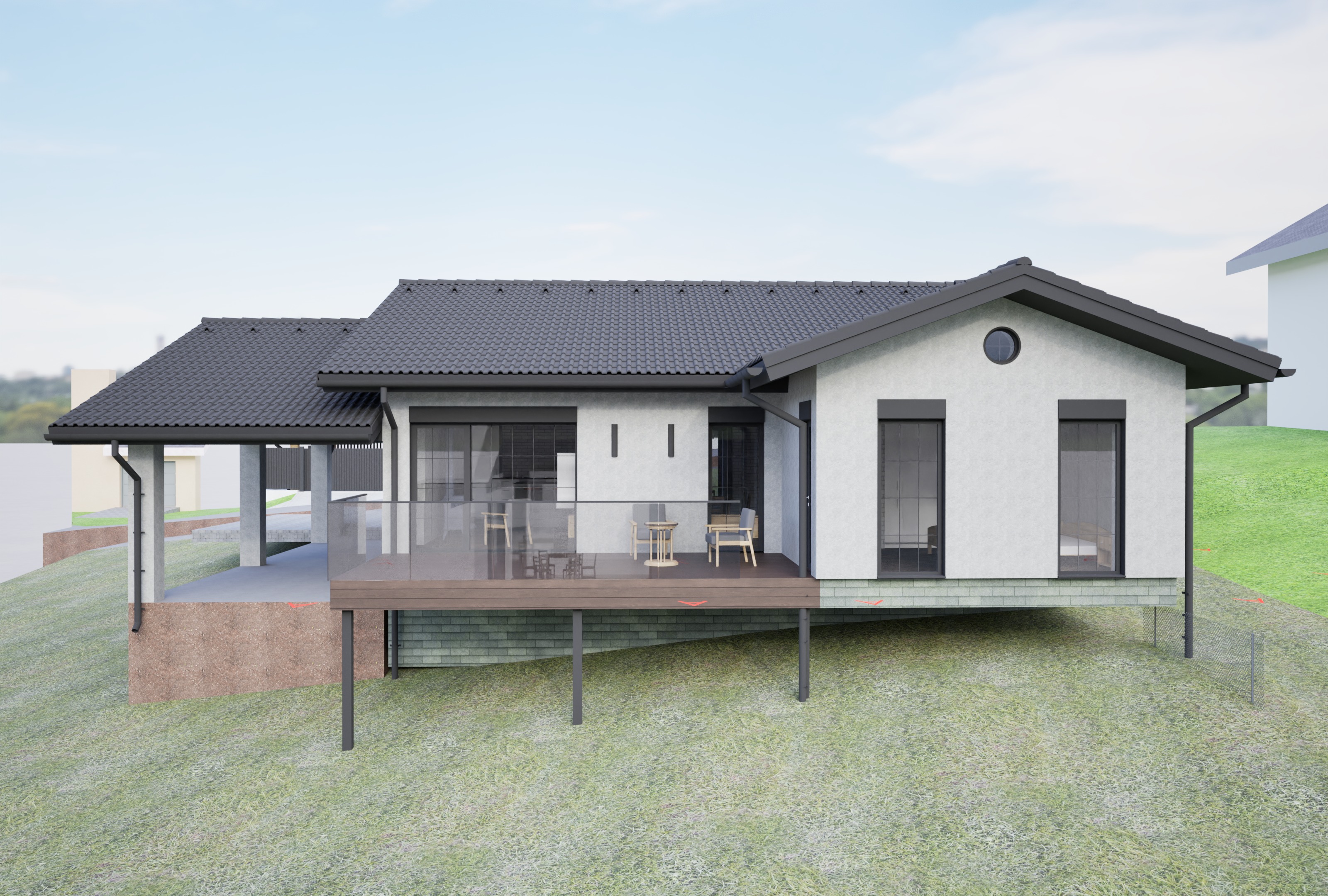 render elevation in a modern feel with off white warm brick and off white warm stone black windows and black window trim dark charcoal roofing with black roof fascia and frieze boards