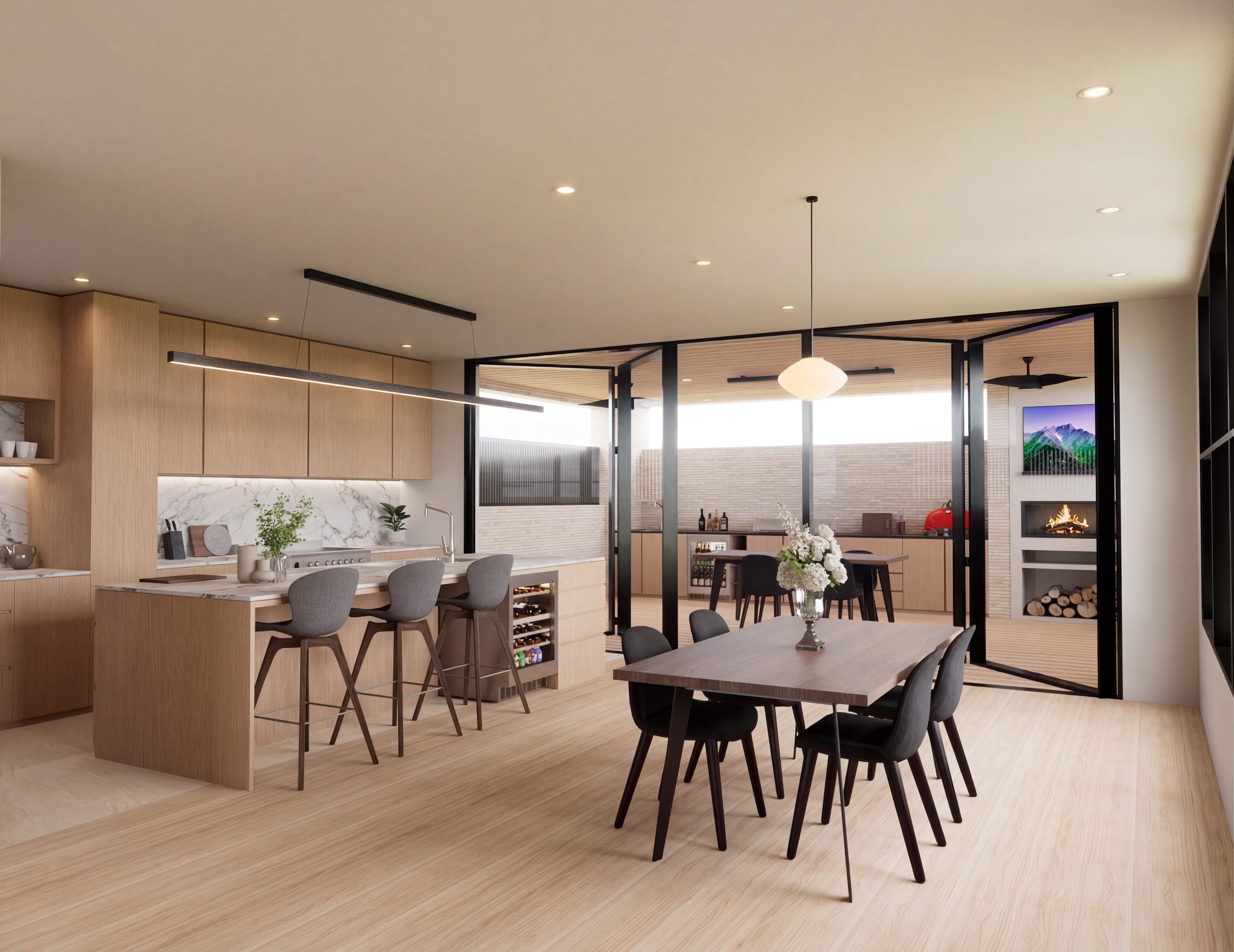 photorealistic premium conference room photography hero furniture conference table large dark walnut wood grain rectangular conference table boat shaped slightly curved long edges rich warm brown walnut veneer deep grain pattern satin finish two flush mounted cable management cover plates on tabletop surface brushed aluminum inlay panels dual solid walnut panel base supports thick slab pedestals full height table seats 10 12 persons conference chairs 10 positioned around table medium back executive meeting chair light silver gray smooth leather upholstery horizontal topstitched lines across backrest round plump seat cushion polished chrome arc armrest frame gleaming mirror finish chrome five star base with caster wheels 2 chairs at each long side 5 per side 1 chair each at head and foot ends chairs at various slight angles natural use position table setting fully dressed each place setting slim leather portfolio notepad dark charcoal uncapped pen beside each pad branded glass water bottle or crystal glass small white card nameplate two chairs have laptops open screens showing presentation content center of table long low floral arrangement white and ivory blooms eucalyptus stems slim rectangular brushed brass vessel two crystal water pitchers with ice visible scattered conference mints in small dishes space world class corporate boardroom feature wall behind head chair full height dark walnut wood slat paneling vertical grain rich and deep matching table wood tone precisely company logo or monogram subtly embossed in center bronze finish indirect led cove lighting at ceiling junction warm amber glow washing down walnut wall opposite long wall floor to ceiling glass partition views of executive floor beyond colleagues at desks softly visible city view partially visible through far windows side wall left large format wall mounted screen displaying financial data presentation slim black frame ultra thin bezel floor large format dark emperador marble deep brown with cream and gold veining high polish subtle table and chair reflections chrome chair base perfectly reflected below ceiling white coffered plaster ceiling deep rectangular recesses recessed warm led downlights one above each seat position central zone flush mounted led panel providing even ambient fill no pendant lights clean corporate ceiling people active board meeting head chair position chairman senior man early 60s dark charcoal tailored suit white shirt silver tie silver cufflinks standing slightly one hand on table addressing the room with authority reading glasses on table before him left side 5 attendees woman mid 40s dark navy blazer pearl earrings taking notes in leather portfolio intense focused expression man late 30s charcoal suit no tie open collar looking at laptop screen typing notes woman early 50s deep burgundy blazer leaning back slightly arms crossed listening and evaluating man mid 30s gray suit light blue shirt raising hand slightly to speak leaning forward engaged woman late 30s black blazer subtle gold jewelry reviewing printed document on table right side 5 attendees various professional attire mix of engaged poses one presenting from laptop one writing one in side whisper to neighbor one reviewing phone briefly one leaning forward listening intently foot of table young associate late 20s dark suit precise posture taking detailed meeting minutes on laptop plants two large kentia palms matte black brushed iron planters positioned at two far corners of room dark fronds arching toward ceiling adding organic softness to formal space two medium snake plants slim brushed bronze rectangular planters flanking main presentation screen wall lighting primary warm recessed downlights one per seat precise pools on table surface walnut table catching warm amber glow grain richly illuminated leather chairs warm highlight on upper surfaces gray leather glowing softly warm chrome frames multiple highlight points each downlight reflected in polished chrome secondary indirect led cove at walnut wall warm wash defining feature wall beautifully tertiary screen ambient cool blue white light from presentation screen falling on right side attendees faces warm cool contrast across room natural city light filtering through glass partition cool ambient from left atmosphere critical quarterly board meeting 10am decisions being made quiet tension and focused intelligence every detail considered and precise color palette dark walnut table silver gray leather chairs polished chrome dark marble floor warm amber wall lighting charcoal suits ivory florals deep green palms quality 8k ultra hd architectural digest corporate photography harvard business school boardroom quality wide angle perspective full table visible from 3 4 angle slight elevated viewpoint showing complete room composition photorealistic material fidelity walnut grain leather texture chrome reflection all perfectly rendered ar 16 9 style raw stylize 185 q 2 v 7