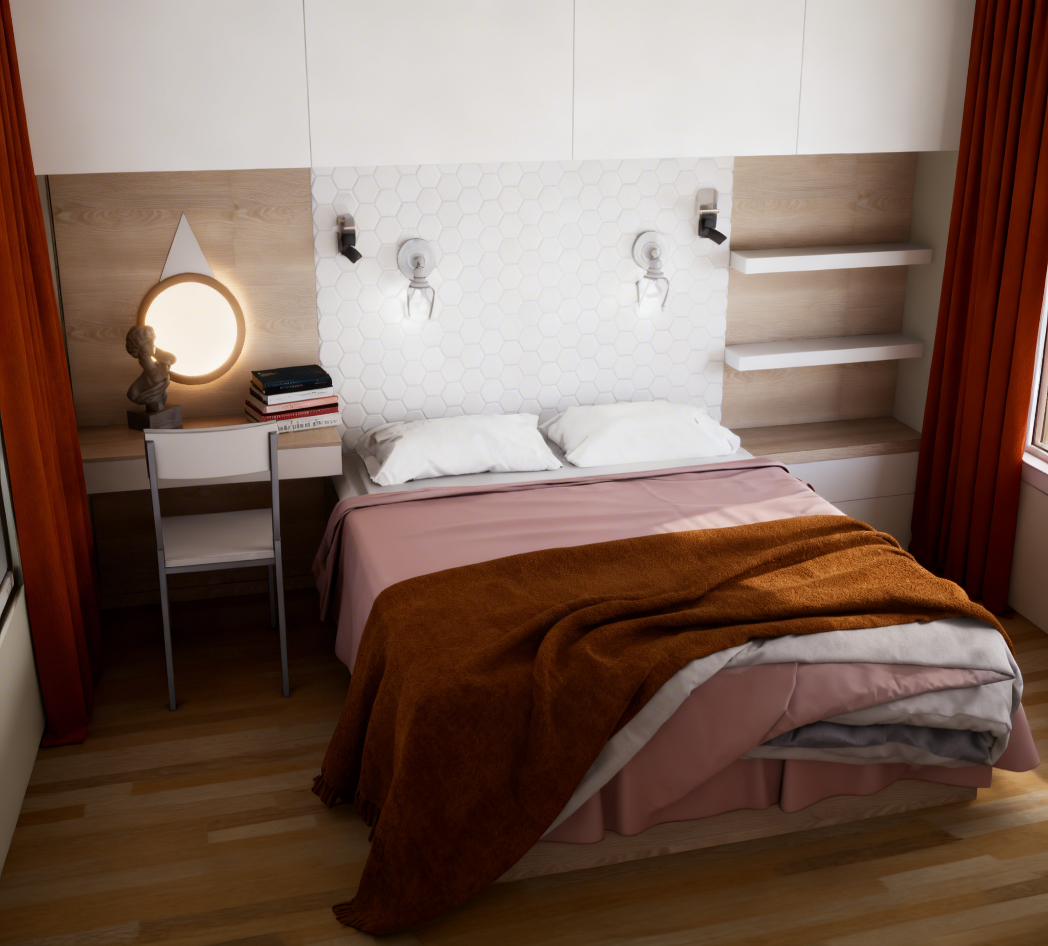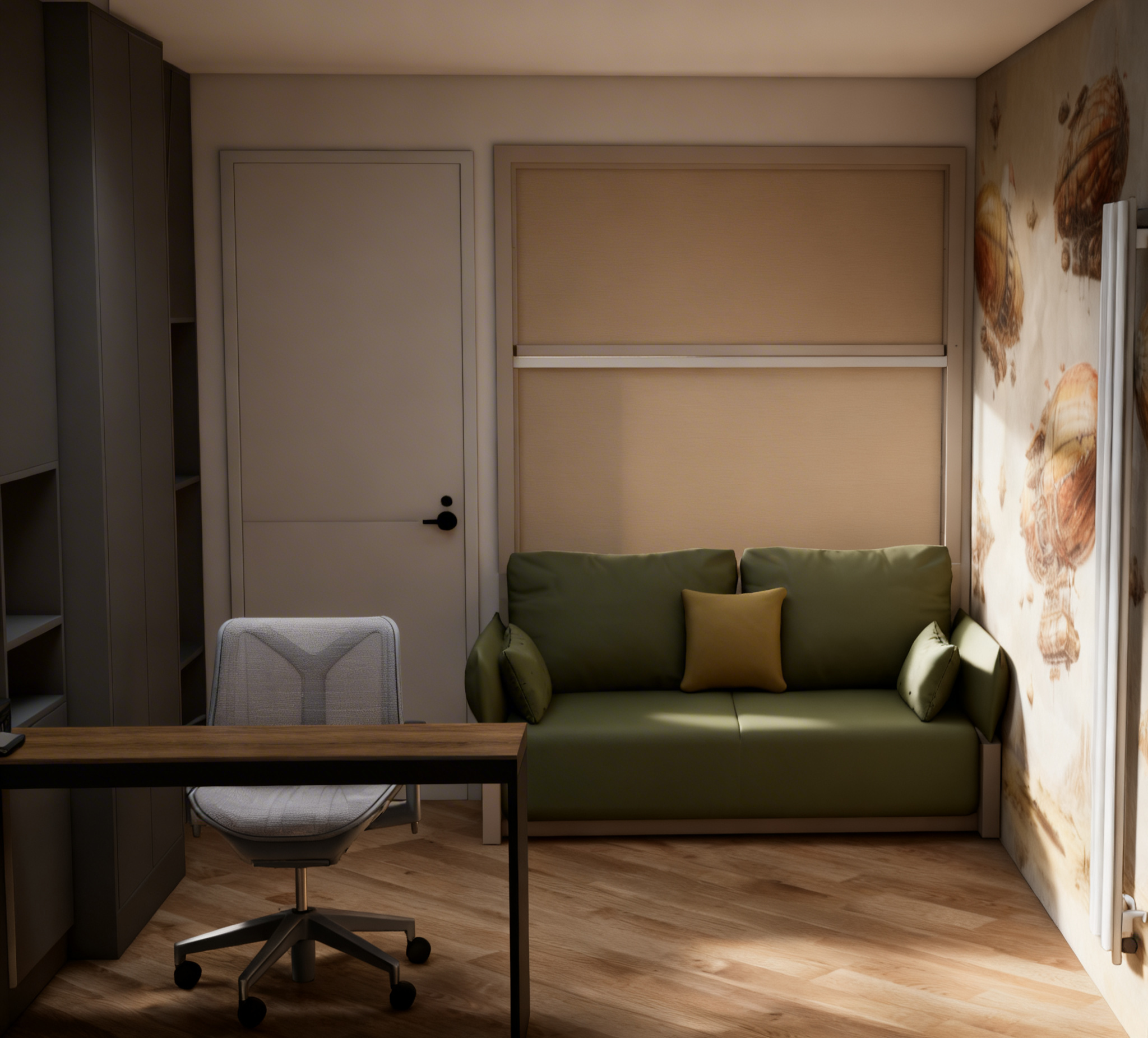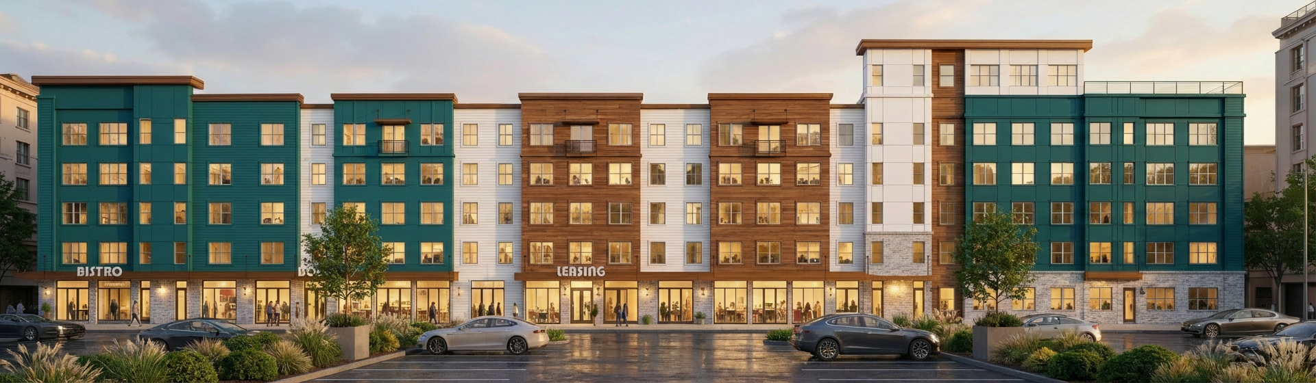 a beautifully rendered cityscape showing a modern apartment building at sunset the building has a combination of white wood brown and teal exterior panels the ground floor has large windows that reveal warmly lit interiors soft reflections glisten on the wet street in front where silhouettes of pedestrians and parked cars are visible the sky is a gentle mix of light blues and soft oranges conveying a peaceful early evening atmosphere