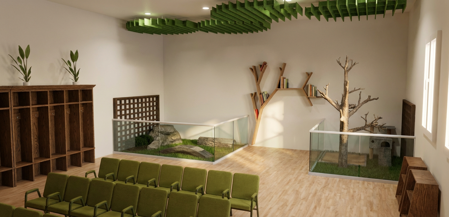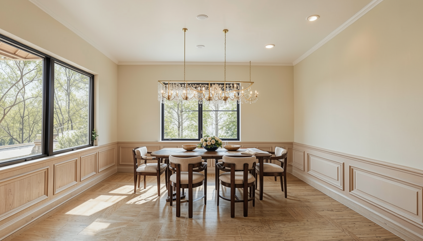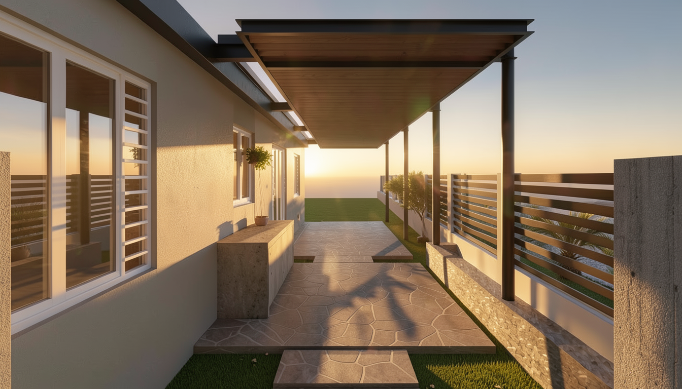 a beautifully rendered cityscape showing a modern apartment building at sunset the building has a combination of white wood brown and teal exterior panels the ground floor has large windows that reveal warmly lit interiors soft reflections glisten on the wet street in front where silhouettes of pedestrians and parked cars are visible the sky is a gentle mix of light blues and soft oranges conveying a peaceful early evening atmosphere