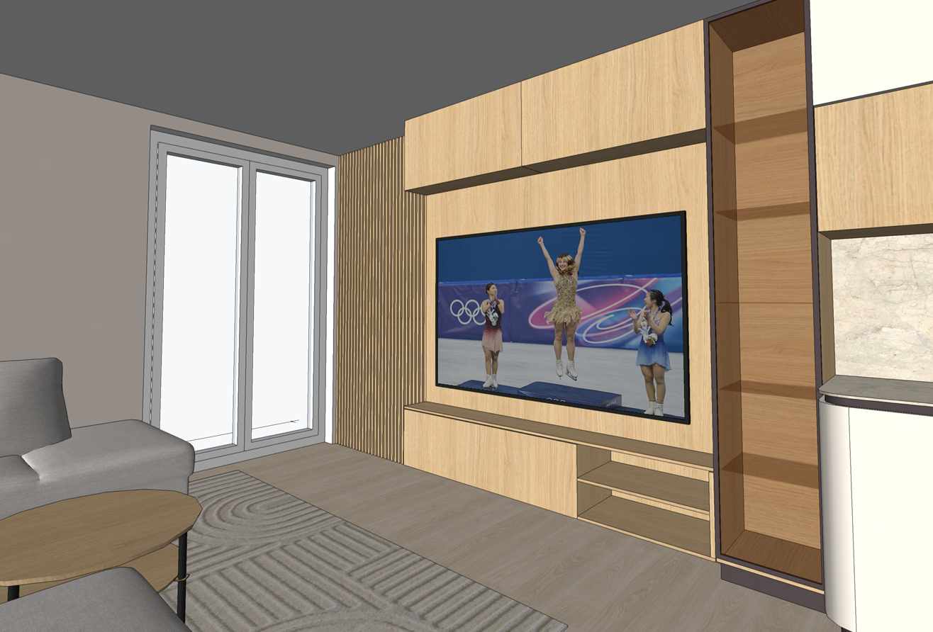 render a realistic interior visualization to the left of the television place vertical wooden slats to the right of the television add a display cabinet fill the cabinet with glassware and decorative vases install light sheer white curtains on the window outside the window trees should be visible use soft subtle lighting with limited direct sunlight creating a calm and natural atmosphere