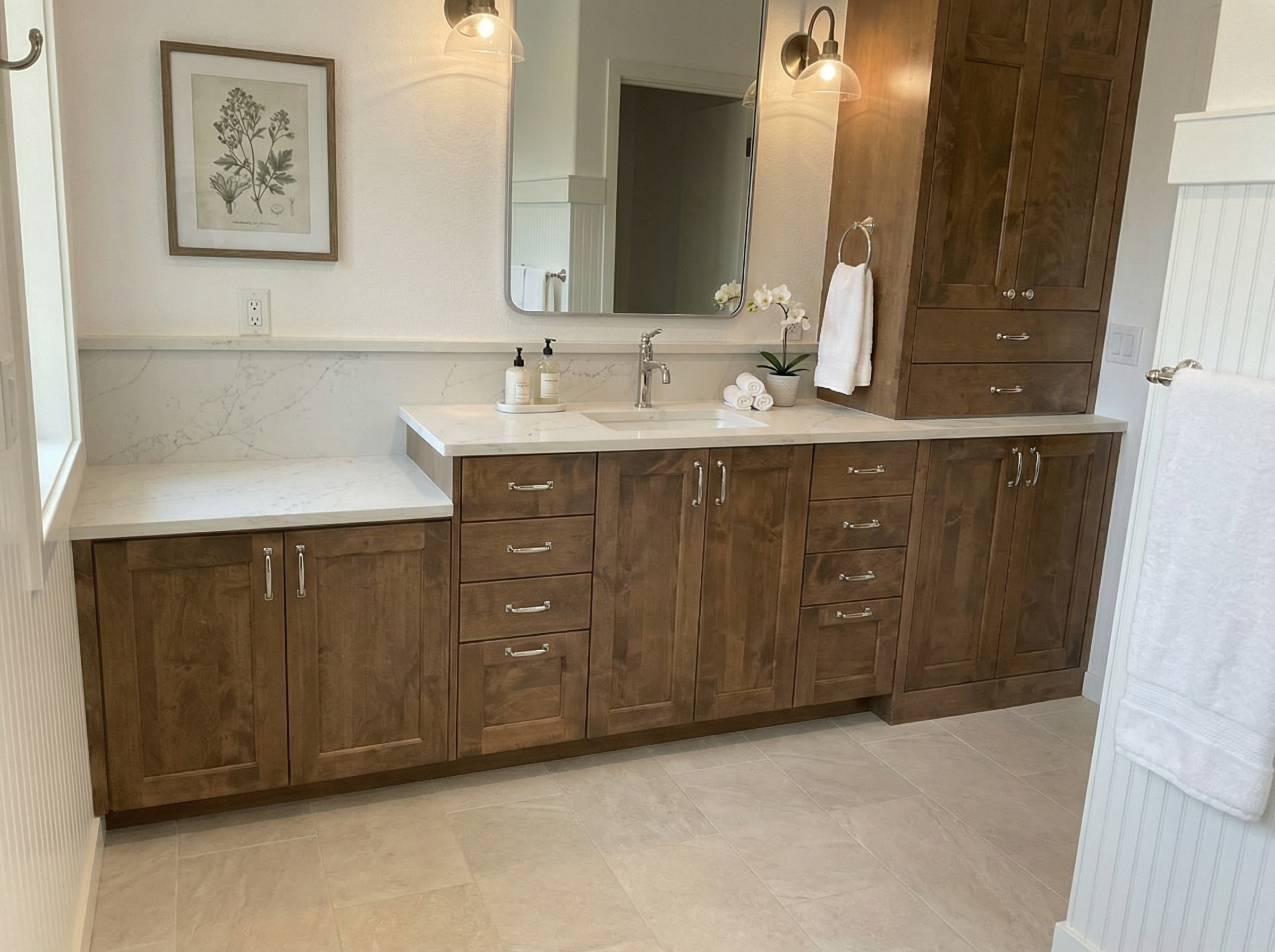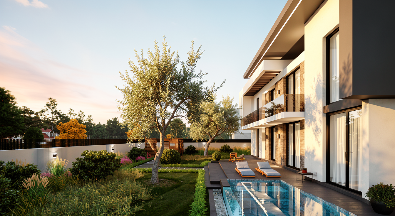 change all the cabinet into a american walnut veneer with the countertop and backsplash in white corian the surface must appear seamless clean and subtly reflective wall cabinets in medium gray matte lacquer finished should be smooth non reflective include indirect lighting under cabinet led strips the lighting should create a soft ambient glow add in both sides of the wall cabinet a floating wood shelf into walnut veneer with under indirect led strips all of the appliances must be represented in stainless steel with realistic reflections and finishes the cooktop is a 4 burner electric cooktop the lightning should be warm and balances the floor change into a laminate wood flooring and white plaster finish on walls and ceiling change the yellow material into american walnut veneer add the kitchen decorating like spice containers whit glass jars with wooden lids replacing a high arc stainless steel single handle kitchen faucet change the red material of the shelves into a american change the color of the wall up to the shelves inwhite plaster finish improve better the american walnut veneer