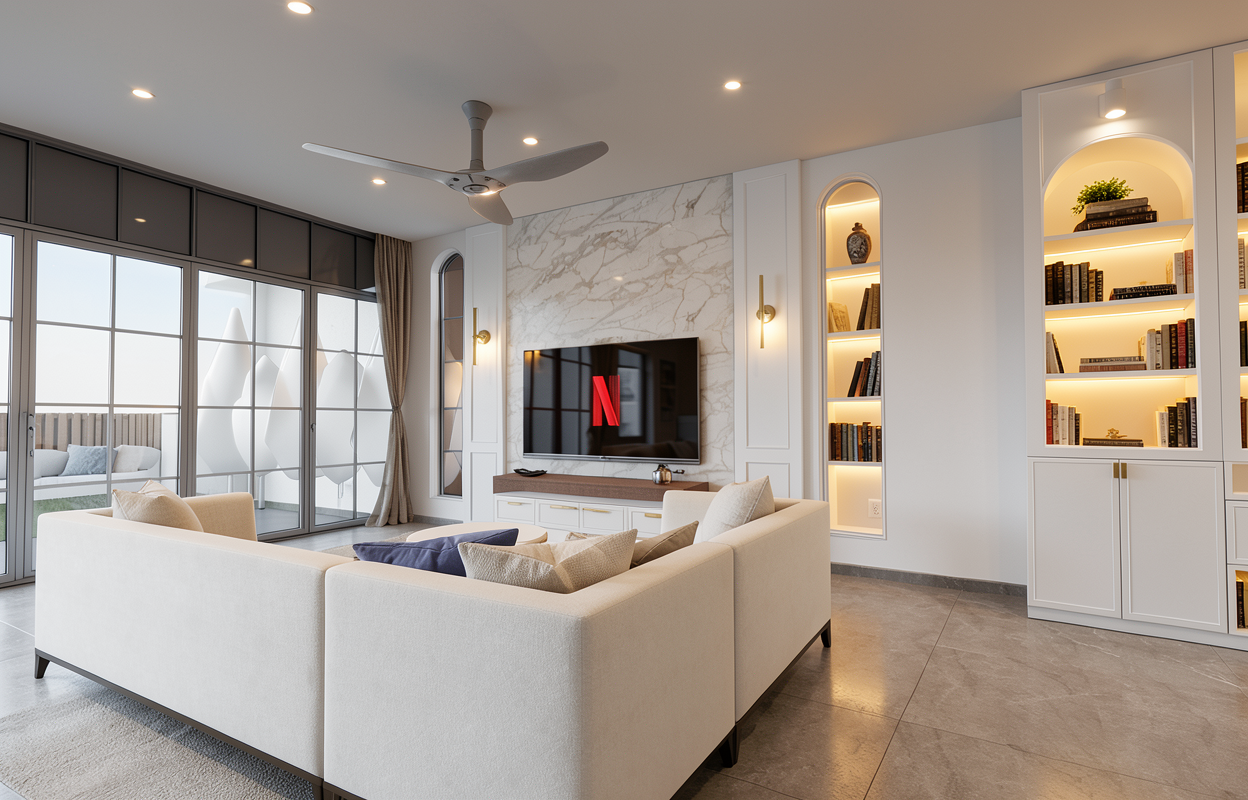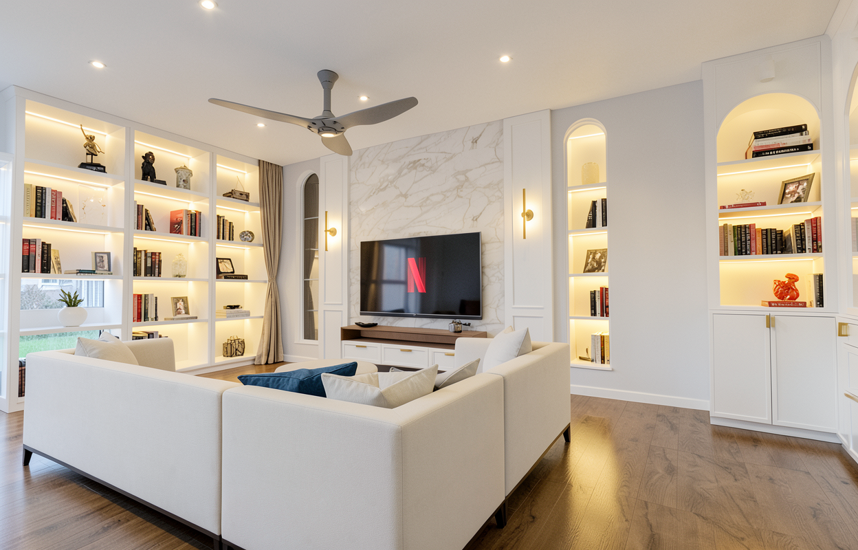 glossier floor decorated solid white bookshelf add led lights inside the cabinets of bookshelf do not change the color of original feature wall 2 boards under the wall lamp is grey