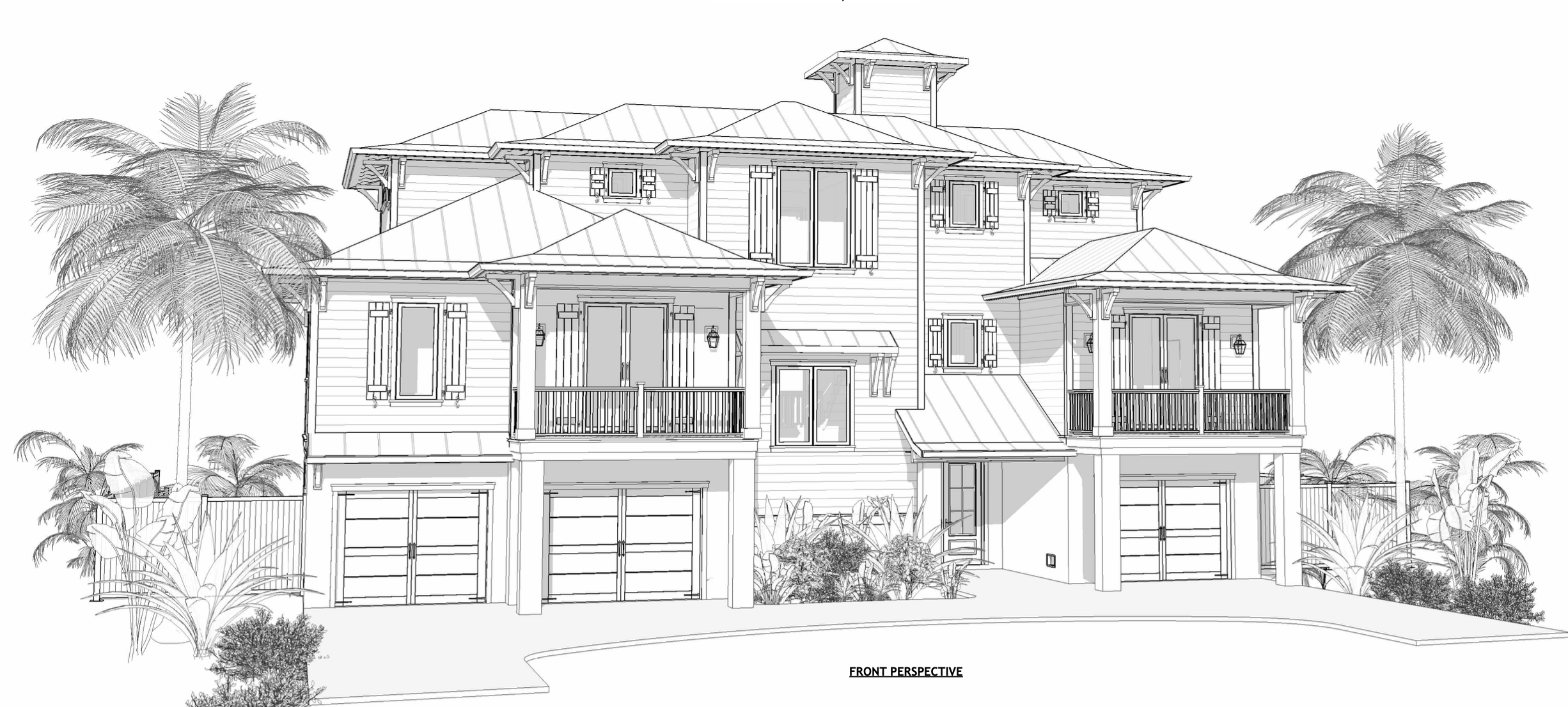 please render this black and white house elevation to show a house color of benjamin moore simply white oc 117 please remove the shutters and have the railing and roof to be the same galvanized steel color add in landscaping a sky and make it look realistic have the front door color be sherwin williams poolside blue can you have the garage door also be a wood stain color can you also change the exterior sconces to be the hinkley georgetown sconce that is burnished bronze