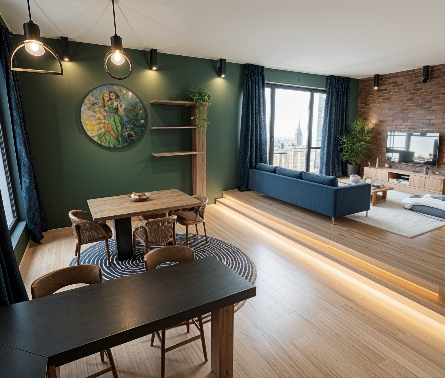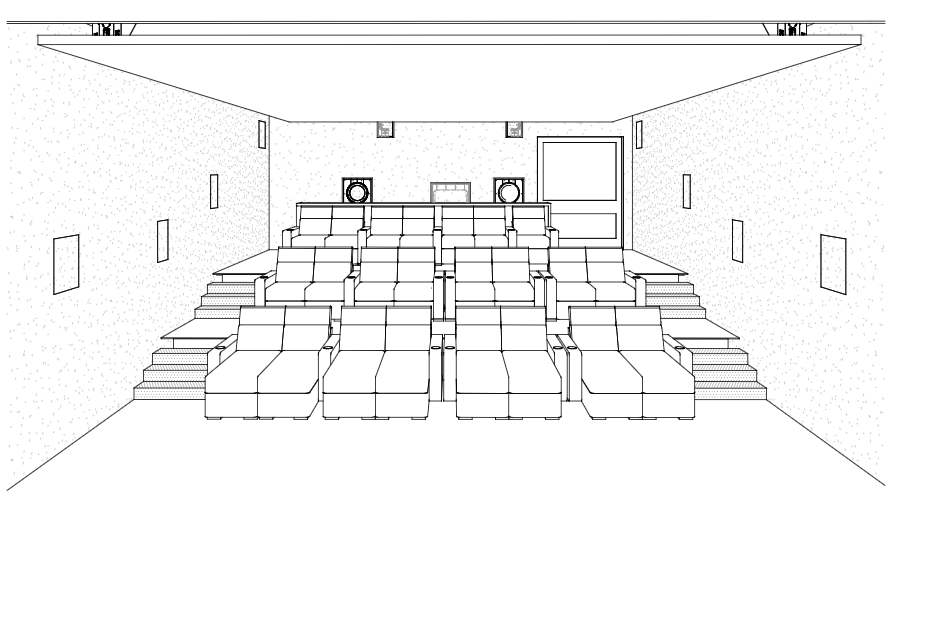 modernist interior shot dark blue fabric panels on walls grey leather seats accent lighting around ceiling perimeter dramatic accent lighting on fabric walls projector light coming from back of room architecture