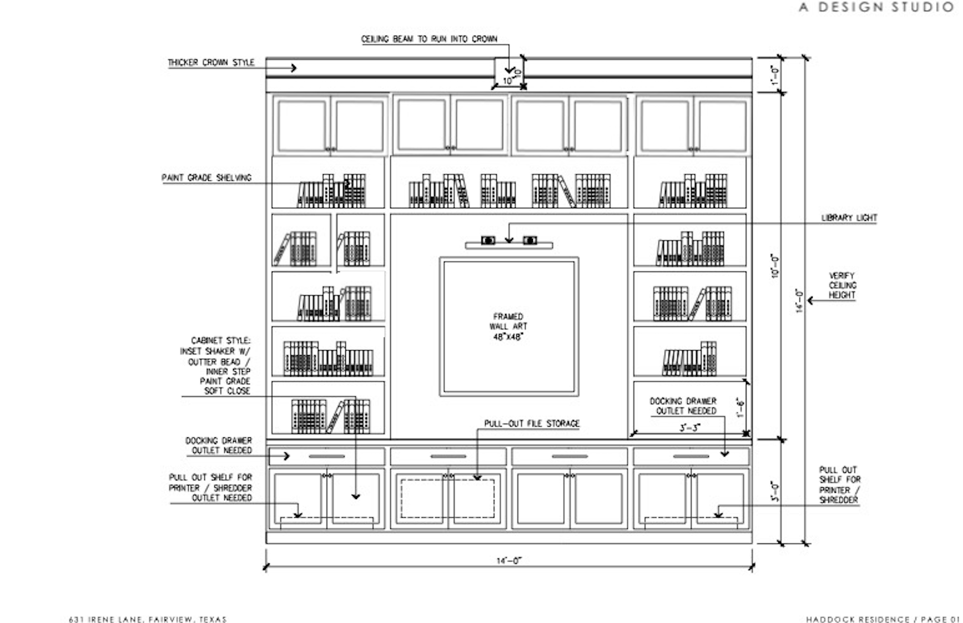 interior shot create a rendering for built in cabinets for a study based on this sketch