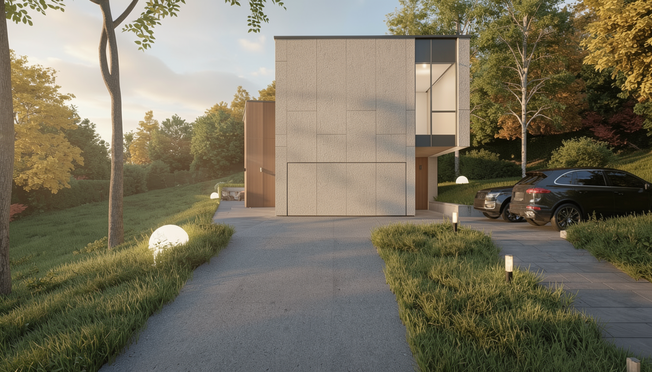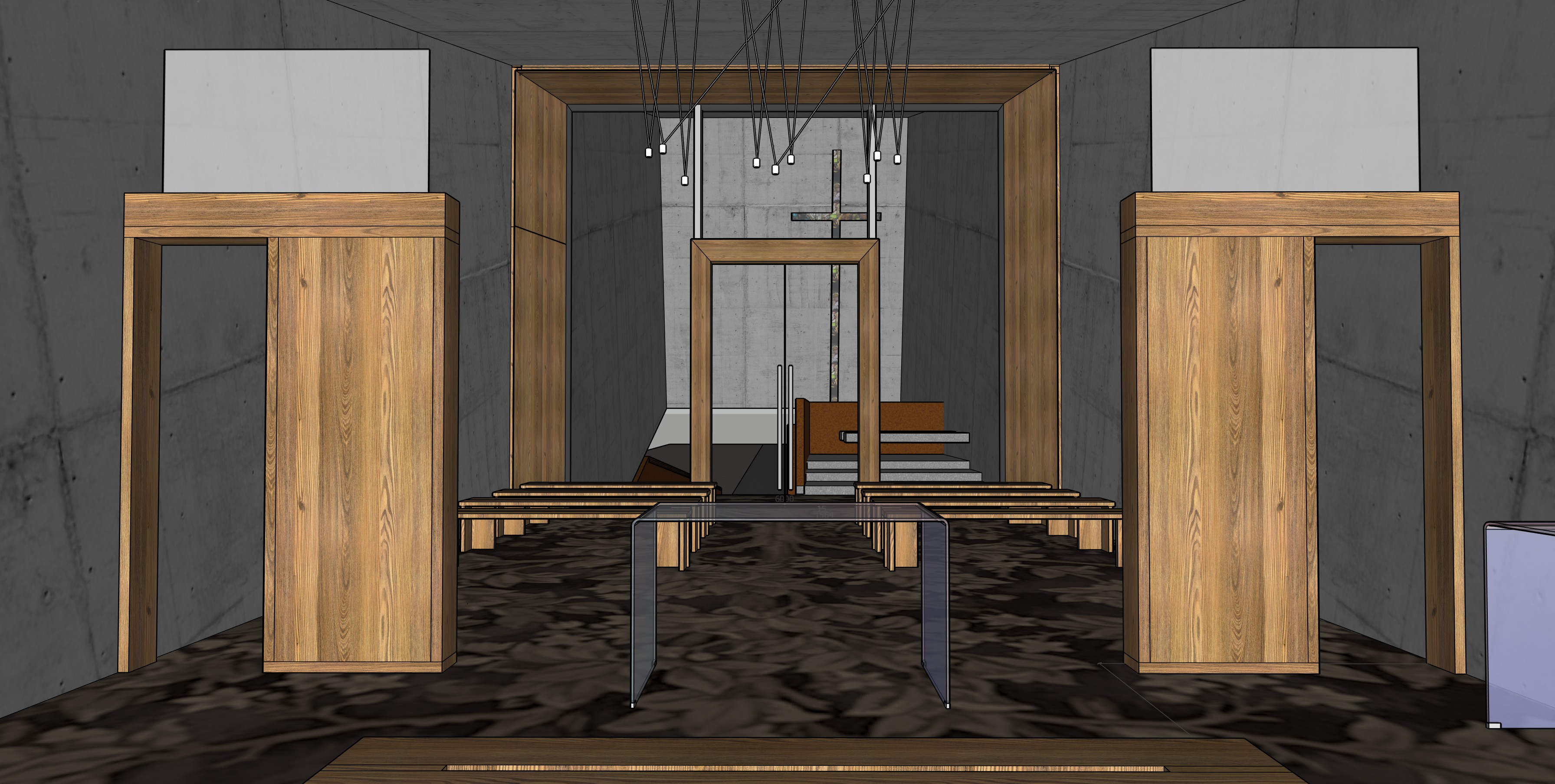 do not change or modify the design or material small mosaic floor with pattern on picture led light from wooden frame edges the building has a ceiling up to back wall with white glass cross cutter into concrete wall no light from ceiling outside outside the building under the concrete walls we look from the second floor to the grassy area
