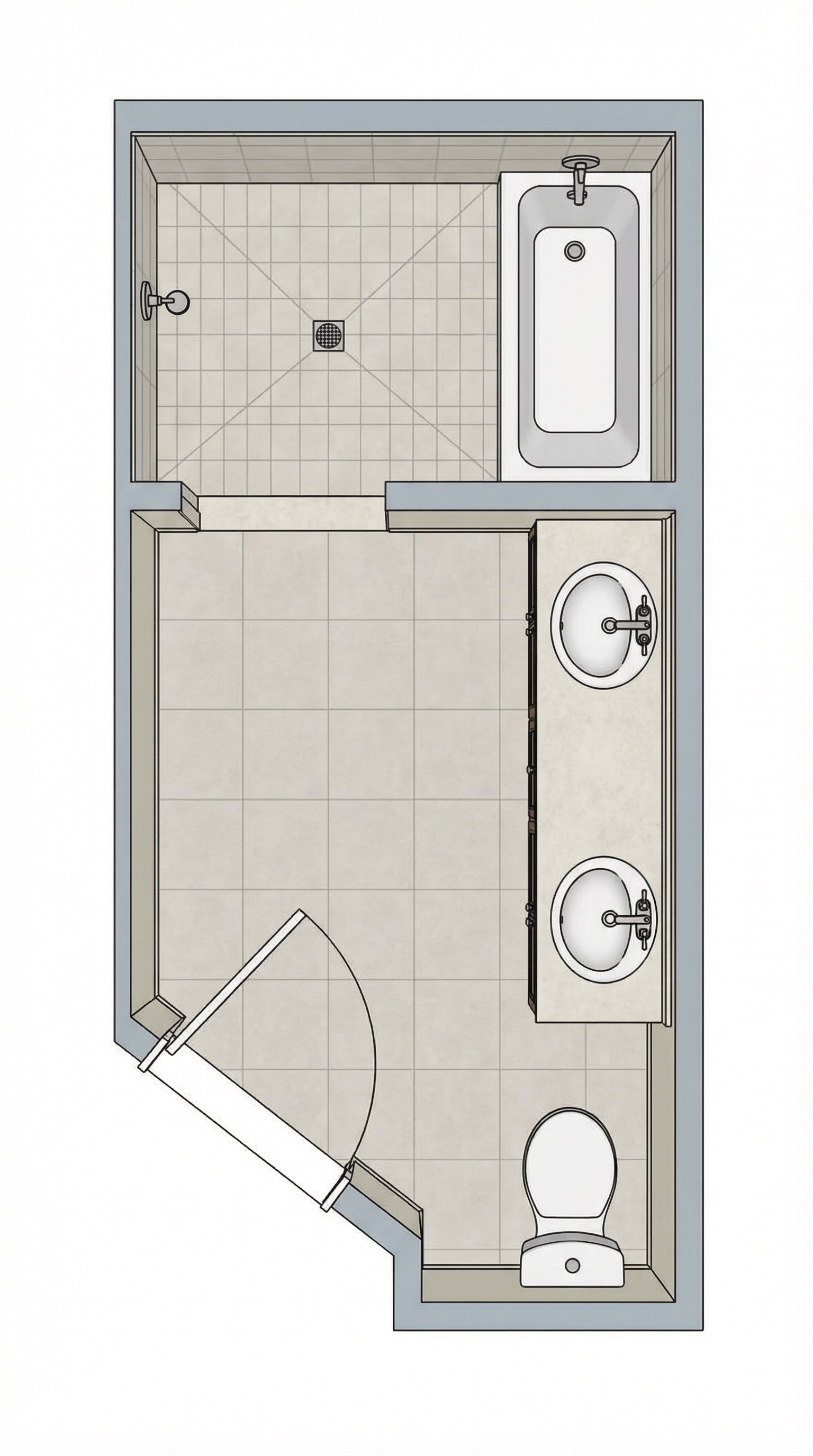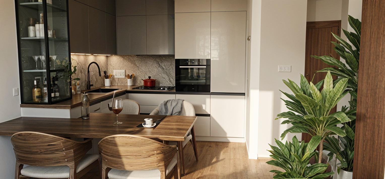 render a modern masculine kitchen with a high ceiling and large windows use soft natural lighting to create a welcoming atmosphere paint the walls in bright white and the ceiling in a light white use sleek stainless steel for kitchen appliances and fixtures choose deep white for the cabinets and island with a polished marble countertop in a subtle white and grey pattern use gold fixtures and hardware set the floor in light grey pocelain tile use matte black for the window and door frames outside depict a lush green landscape behind a concrete stone terrace capture a sense of elegance and tranquility
