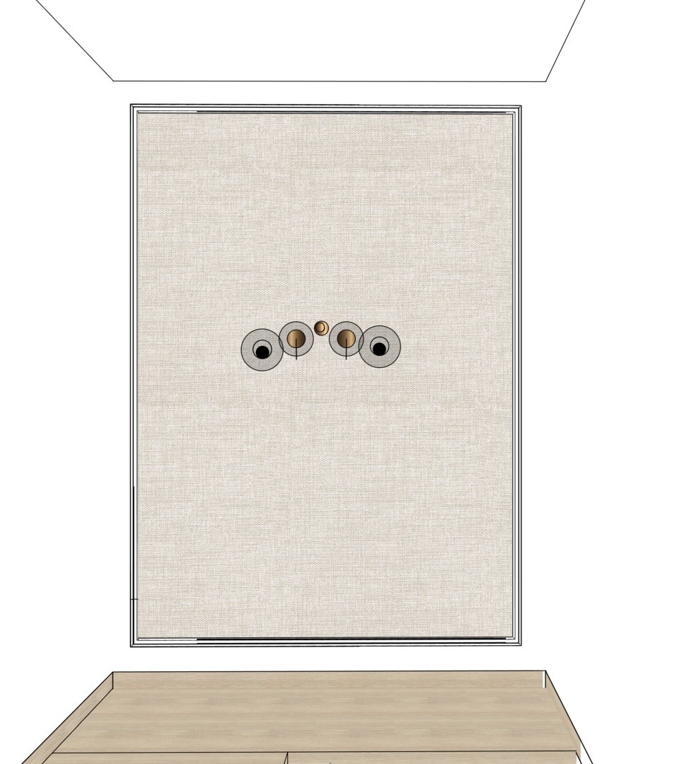 to jest ciana na p pi trze klatki schodowej na cianie wida bia ramk ze sztukaterii w rodku tapeta o strukturze materia u na rodku ciany wisi lampa cienna z oto czarna
