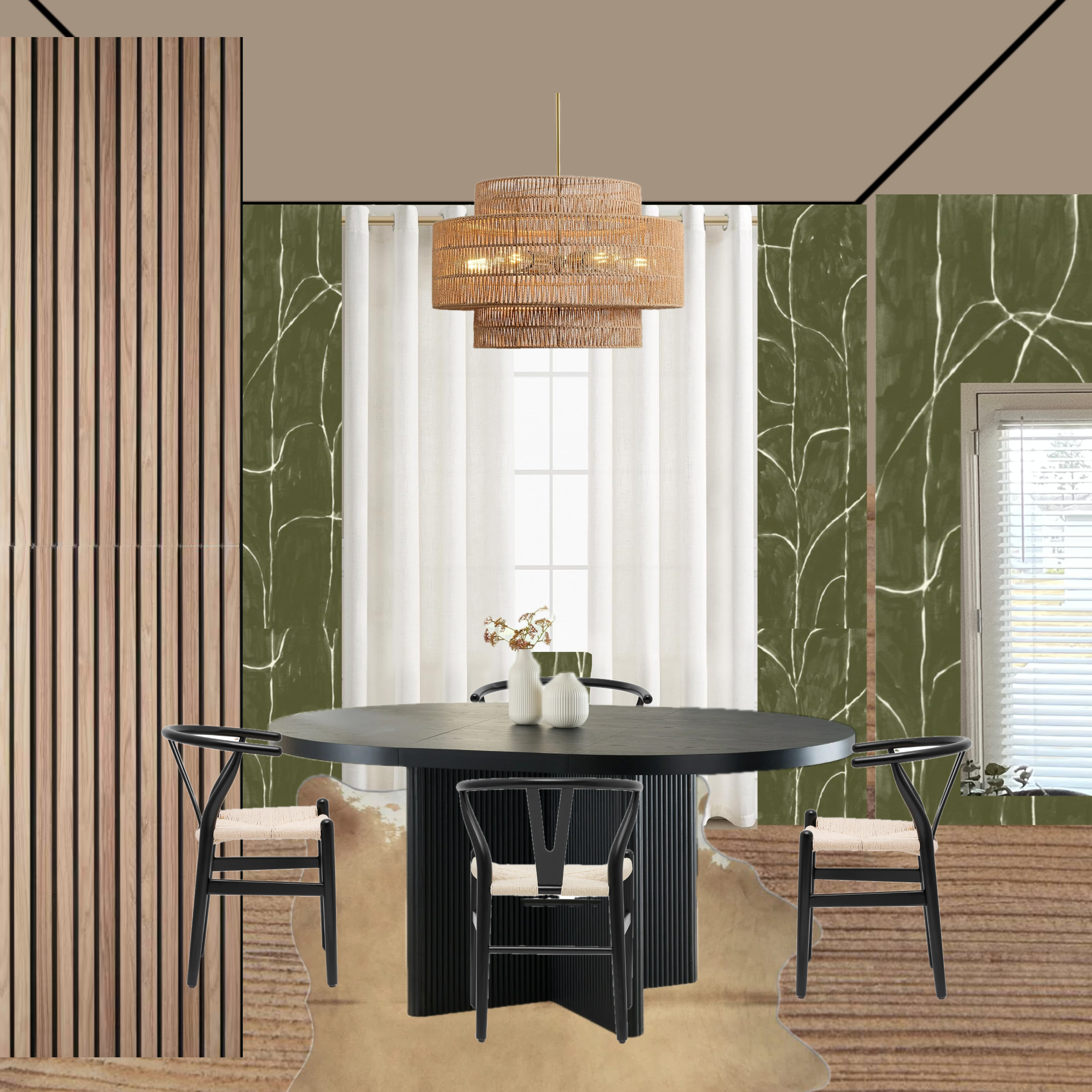 dining room with oak hardwood floors and black round dining table with rattan chandelier and wood panelled wall on the left wall green wallpaper on the middle and right wall window with natural linen curtains in center wall and a door to backyard on the right wall cowhide rug on the dining table