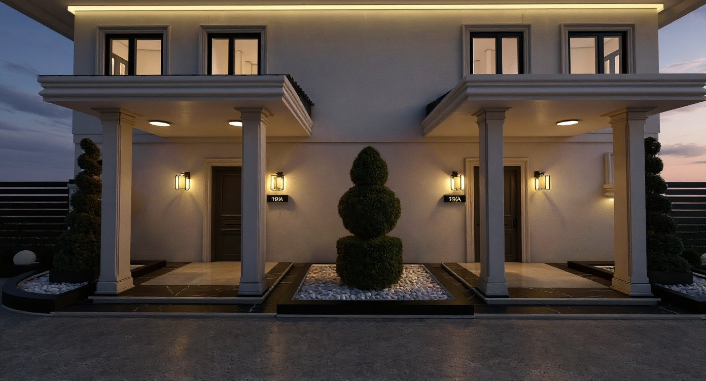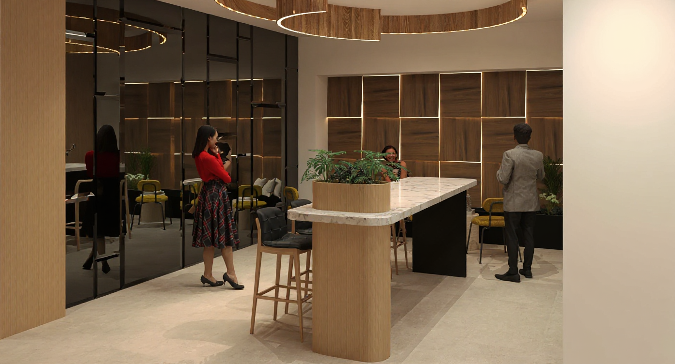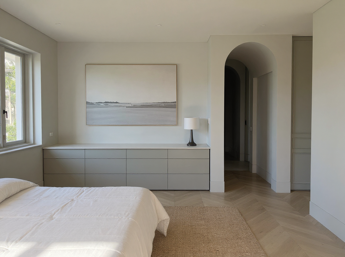 retain all architectural elements and arrangement including the cabinetry remove clutter from cabinetry bench and have a liaigre brizan table lamp on bench towards the left end include an extra large calm yet stormy grey toned artwork in horizontal format above the bench add bed with it s head against the left wall only the edge of it will be visible in the foreground with most of the bed out of frame as the camera is looking over it bed to have austere luxurious oatmeal linen bed sheets that are oversized so they drape to the floor include a natural sisal area rug centred under bed