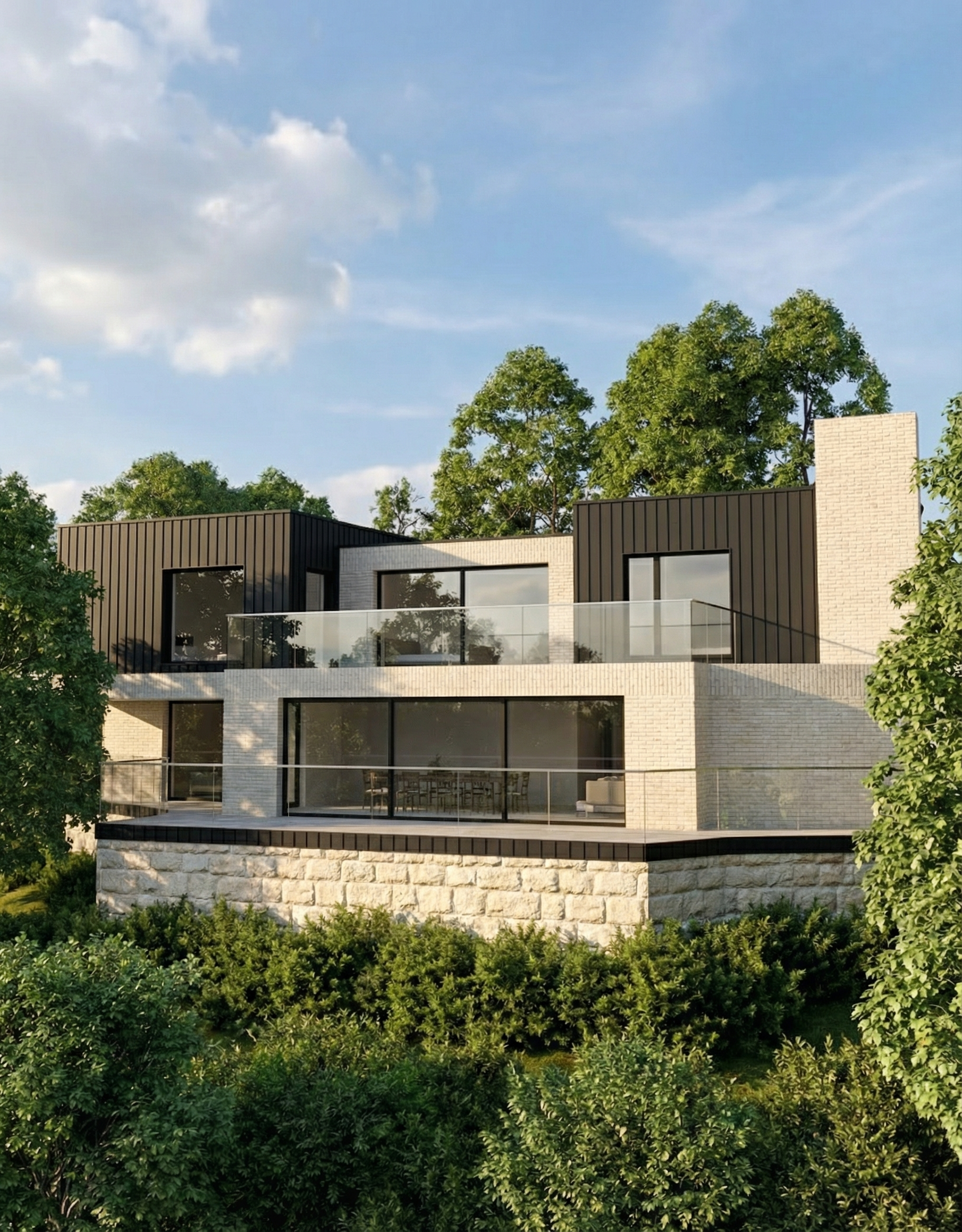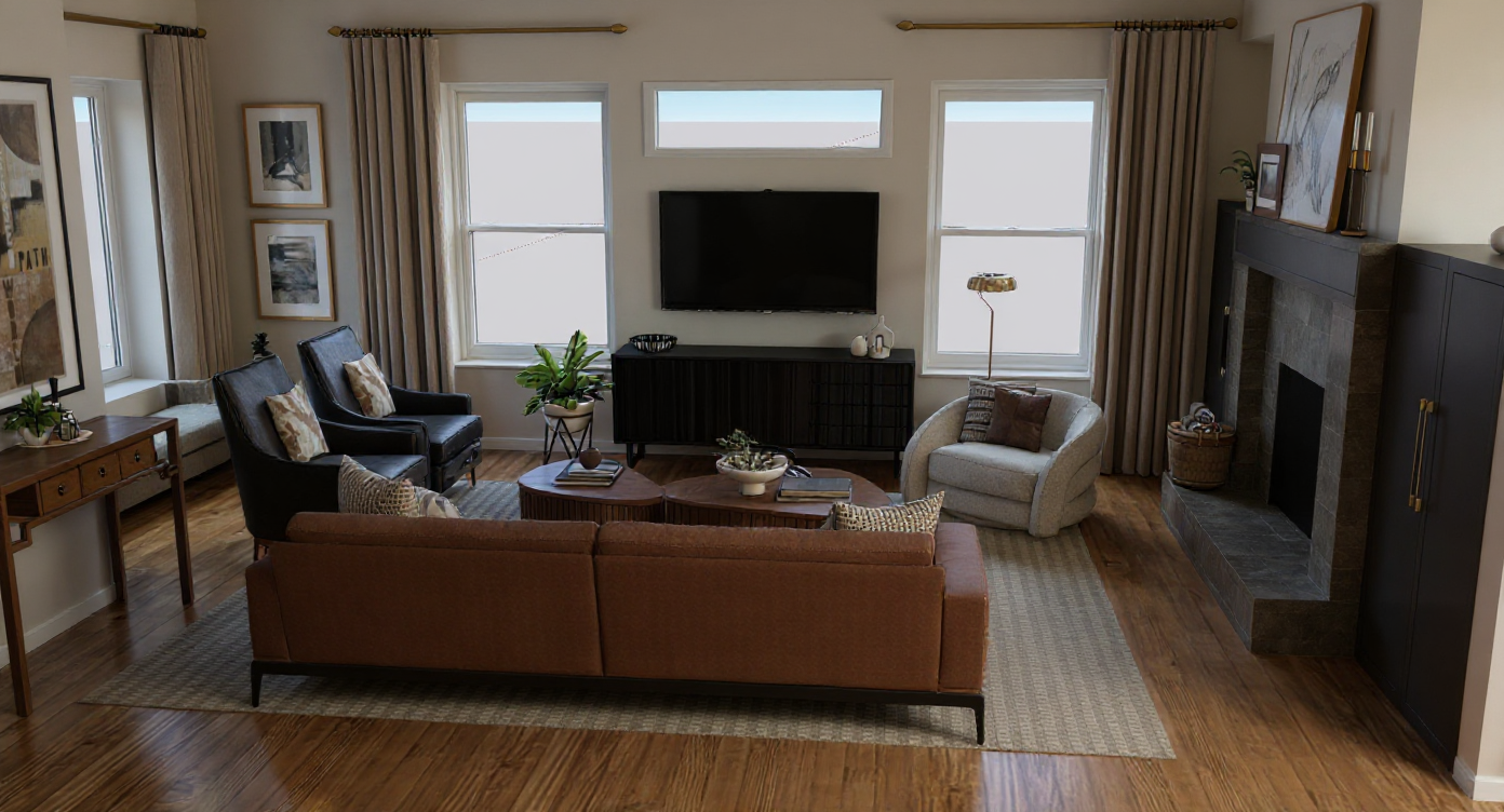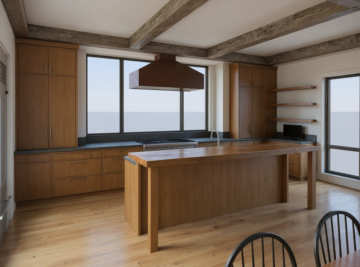 remove bottom window hand side use same color tone to render this one lighter interior space long linear wood panel floor same as previous rendering litter wood floor interior space lighter add a chandelier light above dining table tall ceiling lower the light add 3 pendant light top of the island bigger pendant light see blue line for upper cabinet red light for dining table foots euphonize this drawing make upper cabinet has swing doors add waterfaull for this island lighter interior
