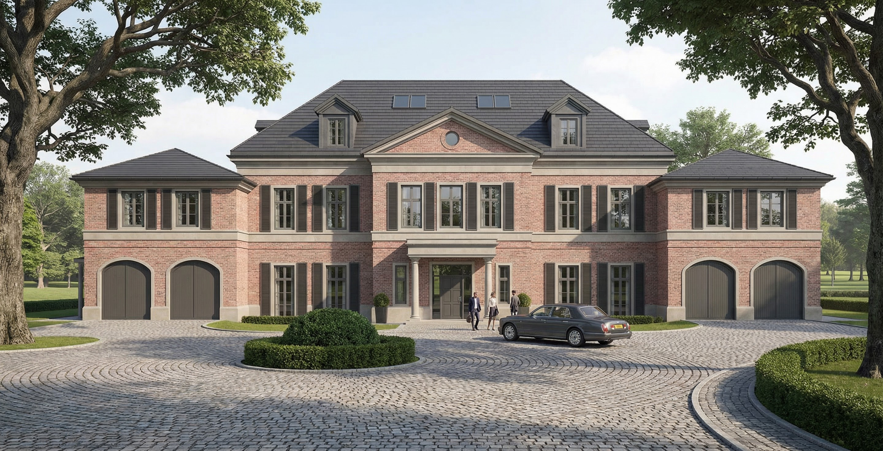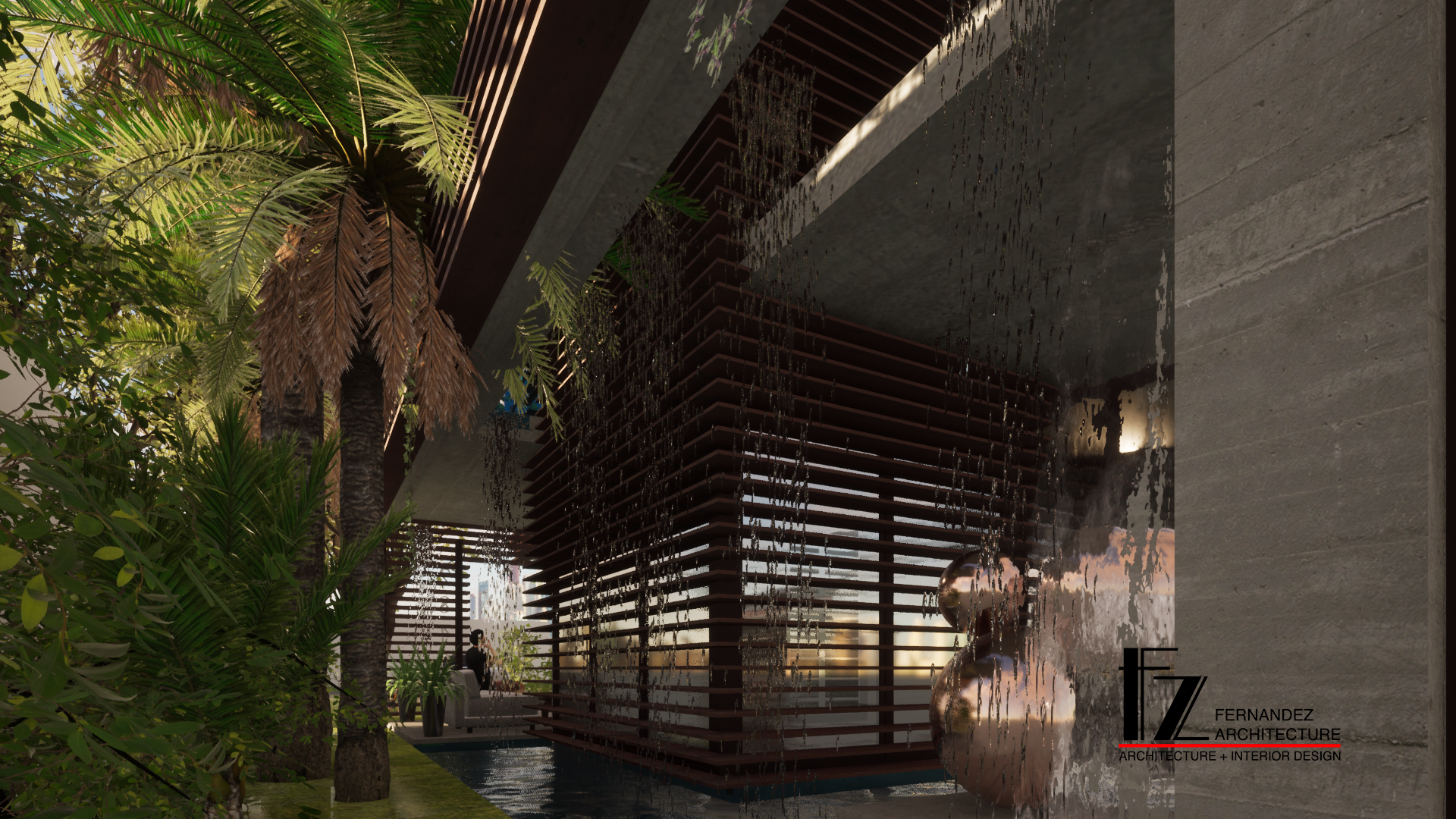 modern architecture house surrounded by lush greenery and tall trees blue sky backdrop vibrant green lawn in the foreground sleek concrete and glass facade warm sunlight filtering through the branches creating dappled shadows vivid blue car parked in the driveway tropical atmosphere with a tranquil ambiance use a soft color palette focusing on greens blues and neutral tones for an inviting and serene environment