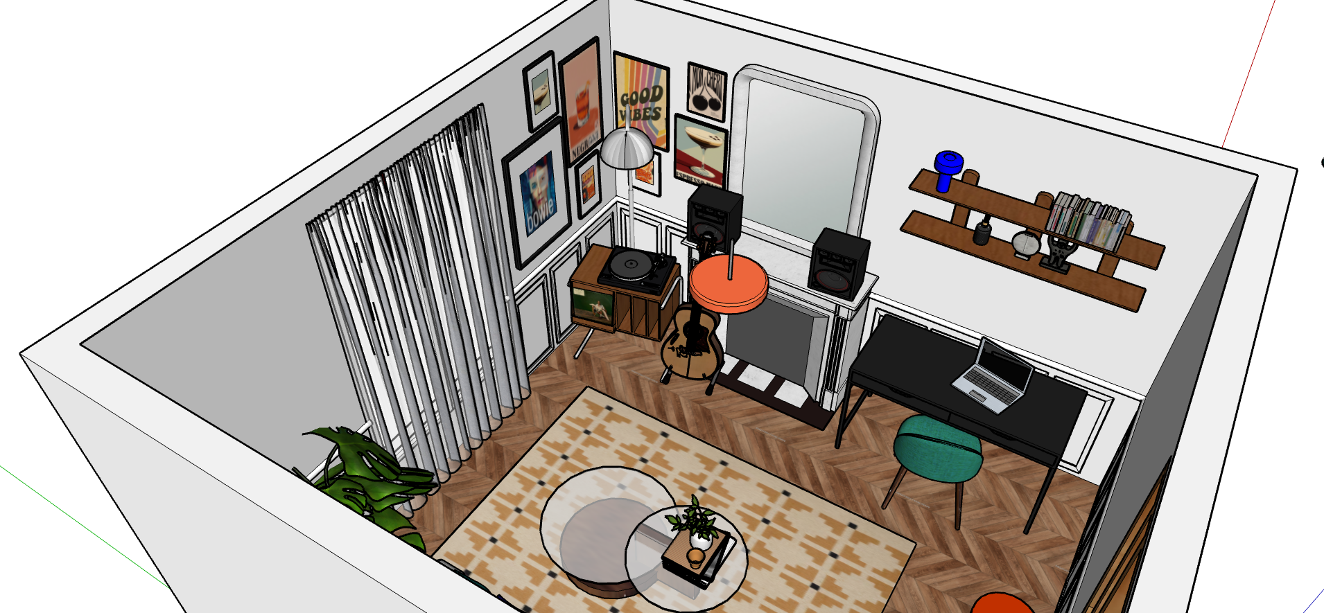 interior shot the orange round on the middle of the picture is a lamp fixed on the ceiling on the left of the main wall it s a vinyl armchair for vinyl music discs on the middle it s a cheminee and on the right it s a desk