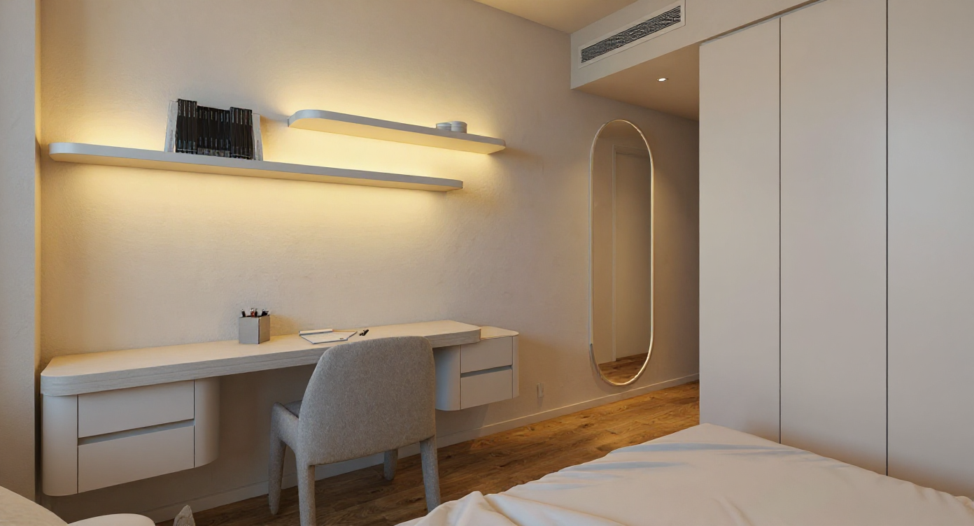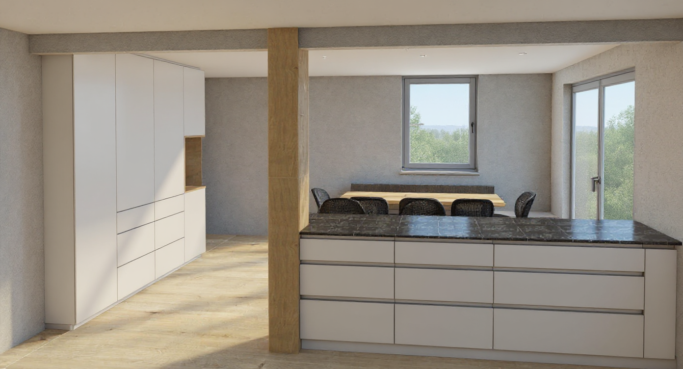 sunny morning day in the kitchen the cabinets in white matt surface countertop in black stone led above the sink lightspots on the top for more brightness the floor in beige white tiles like a stone led strip above the sink more light in the front of the kitchen village in the background
