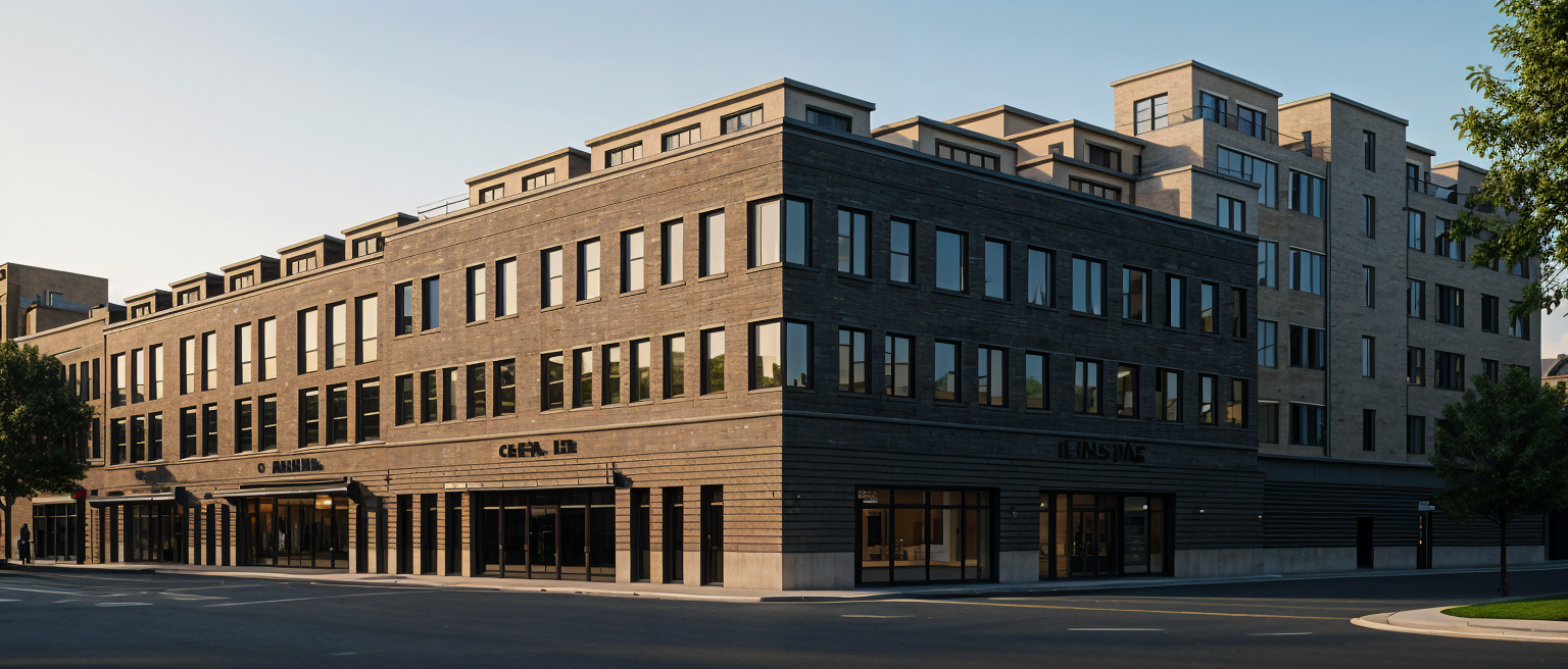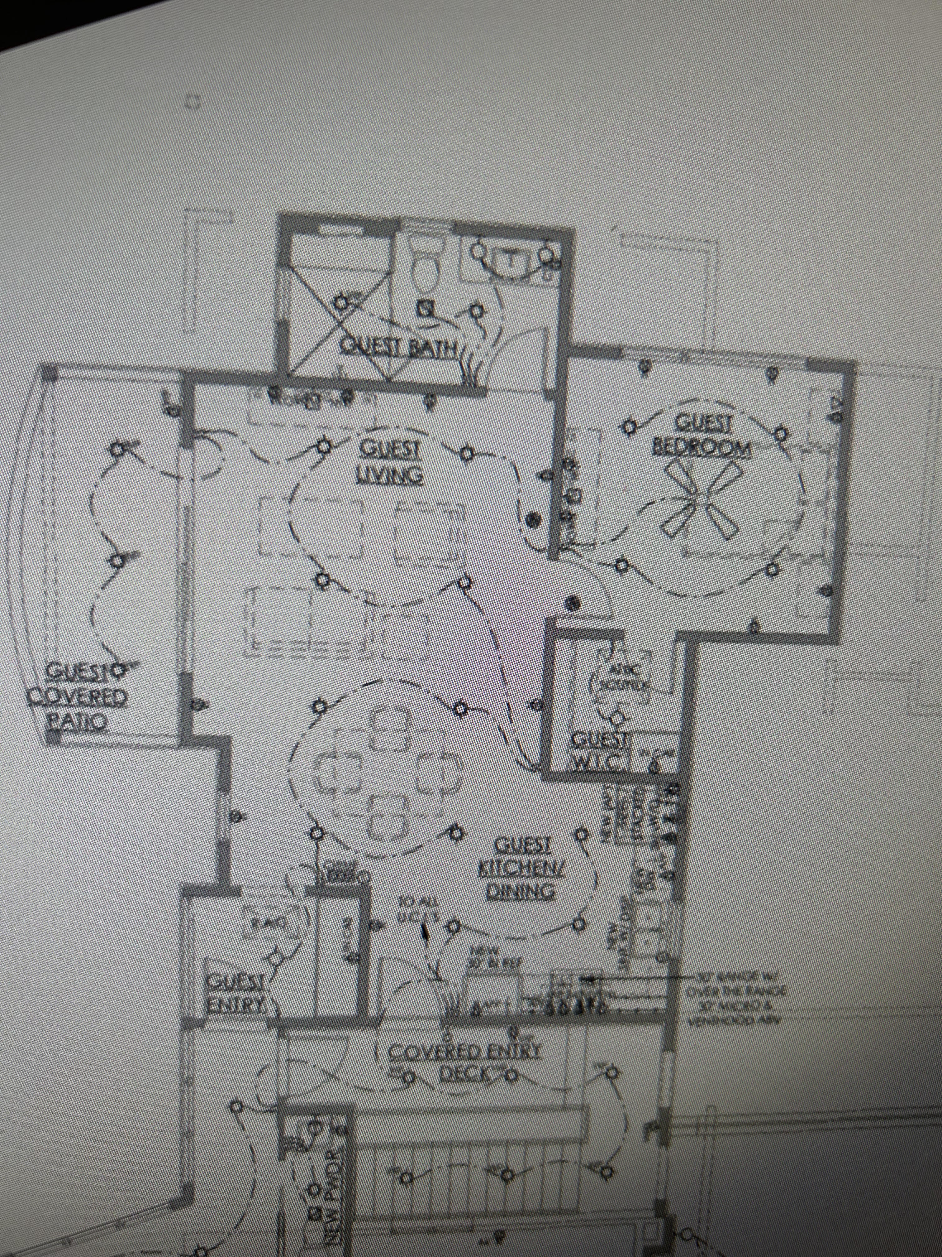 create a beautifully rendered architectural illustration of a modern guest house floor plan use soft natural colors to evoke warmth light oak wood for the floors creamy white for the walls and soft gray for the furniture add accents of muted green for indoor plants introduce large windows to invite natural light showing a sunny day atmosphere with the shadows cast in the rooms ensure a cohesive and welcoming atmosphere with a minimalist aesthetic