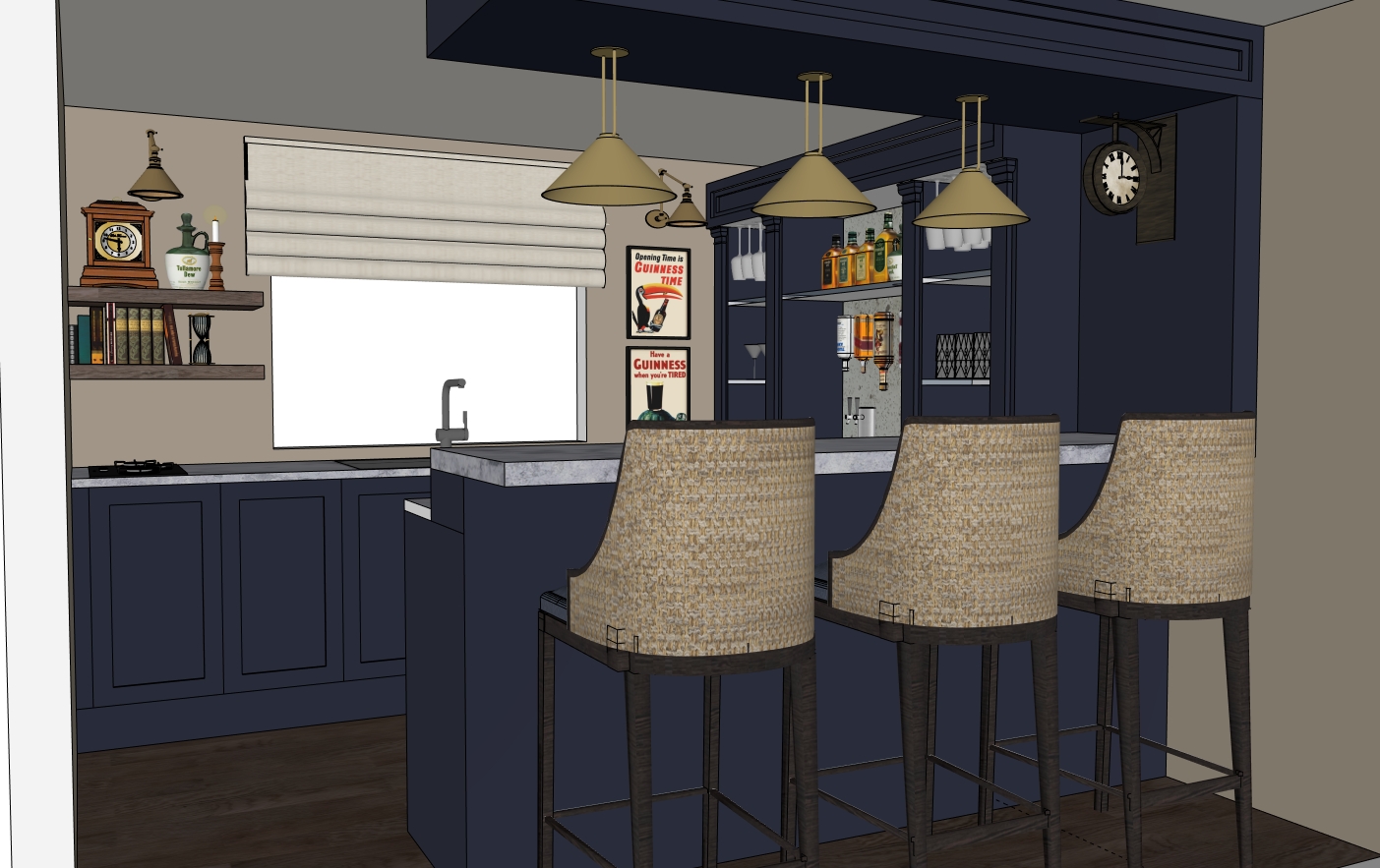 render a cozy and inviting home bar with a focus on a sophisticated atmosphere use a deep navy blue color for the cabinets and bar structure ensuring a rich and elegant feel incorporate warm beige for the woven bar stools and light wood accents for the shelves add soft golden accents to the pendant lights for a touch of luxury the countertops should be a light bluish grey marble providing a subtle contrast include vintage style wall clocks and artwork with a classic design enhancing the vintage atmosphere the window blind should be a neutral beige softly diffusing natural light to highlight the space the flooring should be a dark wood grounding the space and adding warmth overall the ambiance should be a blend of classic elegance and cozy charm