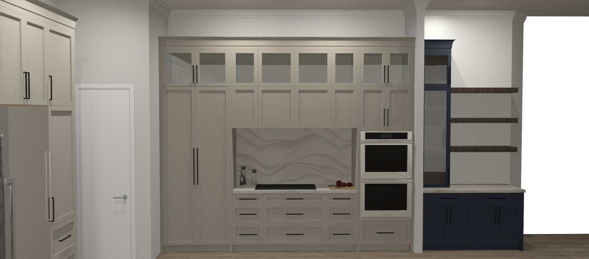 add led strips on ofloating shelves and led strip on sides of tall blue cabinet place liquir bottles on shelves inside tall glass cabinet