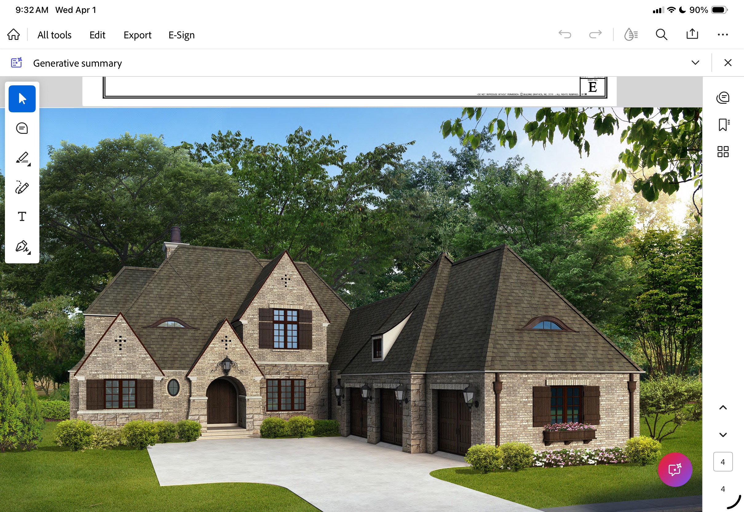 photo realistic wet driveway black roof black windows black eaves country french light beige brick light tan stone with a mix of gray keep all details turn on lights