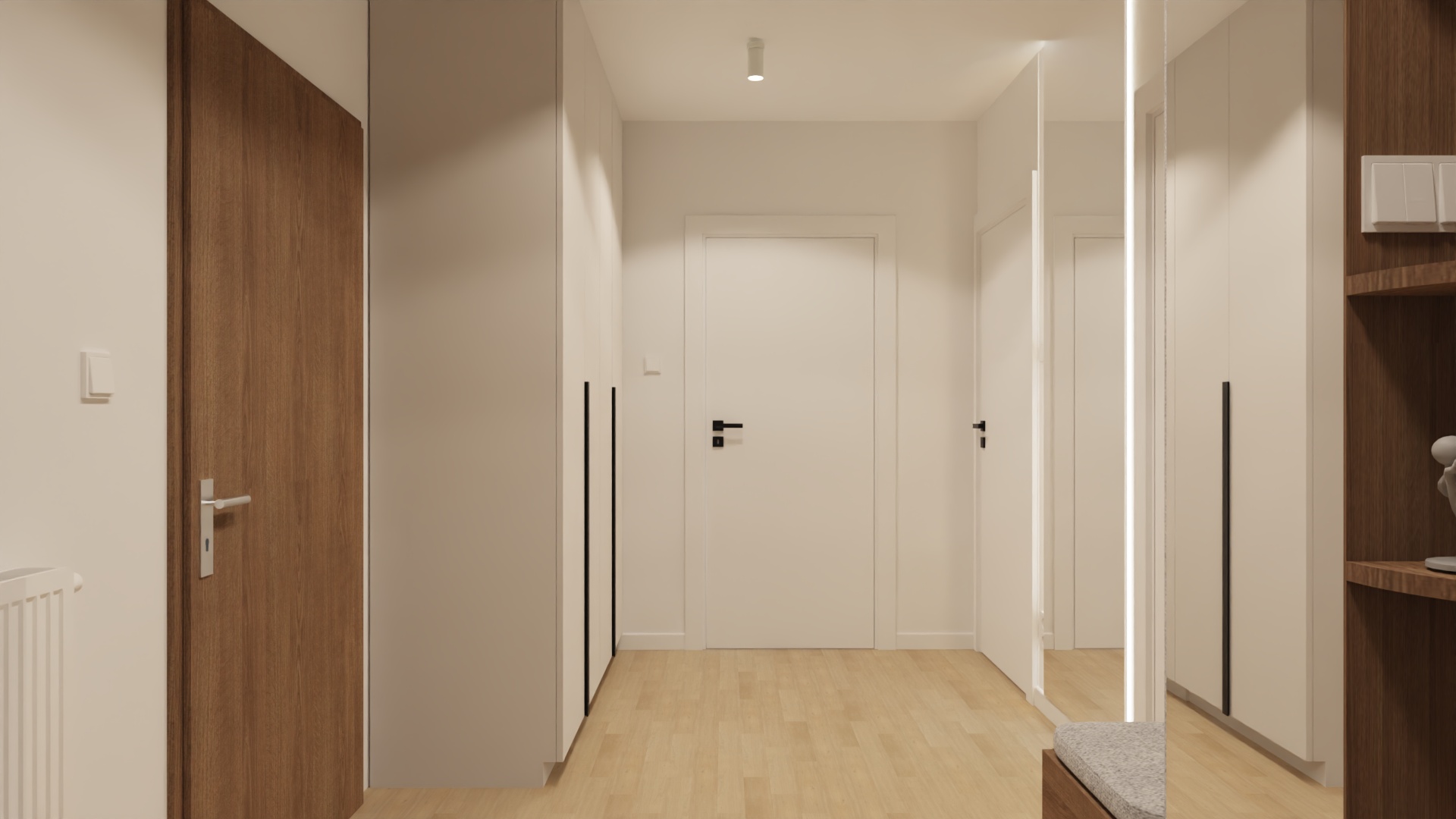illumination in the interior as on a cloudy day transform the input interior design photo into a hyper realistic architectural visualization of a contemporary modern interior preserve exact geometry layout proportions and material intent from the original design lighting create soft overcast daylight atmosphere similar to a cloudy rainy day without visible rain with diffused natural light entering maintain balanced contrast no harsh shadows no overexposure materials textures enhance material realism micro details surface imperfections soft reflections accurate roughness physically correct light response emphasize textures wood grain fabric weave concrete metal and matte finishes high micro contrast and tactile depth rendering style ultra photorealistic architectural visualization cinematic quality natural color grading neutral tones soft highlights realistic global illumination physically based rendering high dynamic range premium interior photography style camera composition wide angle architectural lens natural perspective eye level viewpoint deep focus sharp details across the frame natural framing no distortion atmosphere calm elegant contemporary premium residential mood clean minimal refined without visual noise output 8k resolution ultra detailed noise free crisp edges professional architectural rendering quality white sockets do not add any led lighting straight ahead on the left side is a white door with a frame szafa jest kolorze bia ym ciany s bia e puf jest w kolorze jasnoszarym ze struktur splotu dodaj w czone o wietlenie w kinkietach negative prompts no rain droplets no lens flares no fog no haze no bloom no motion blur no cartoon no stylization no oversharpening no artificial glow no unrealistic reflections no distortion no clutter no led lighting no window