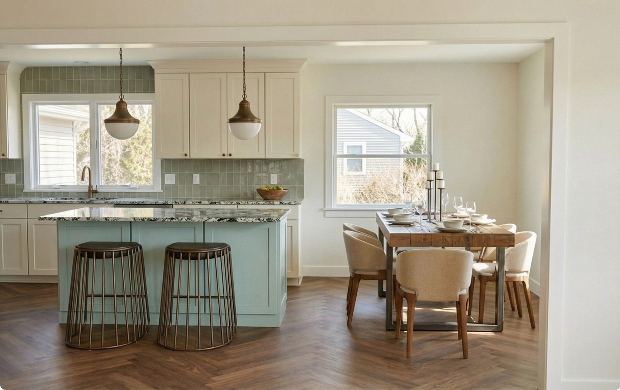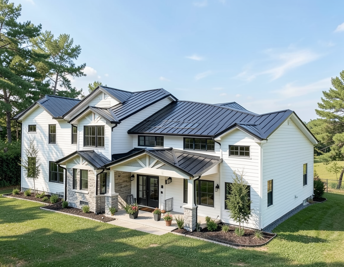 12 black standing seam roof white vertical board and batten siding natural wood post and beams rolling hills planting at perimeter and trees