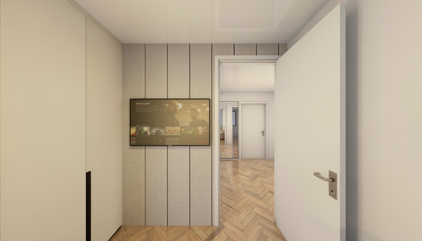 modern wall tv with textile wrap realistic render change floor boards change textile to light grey make it more modern and minimalist