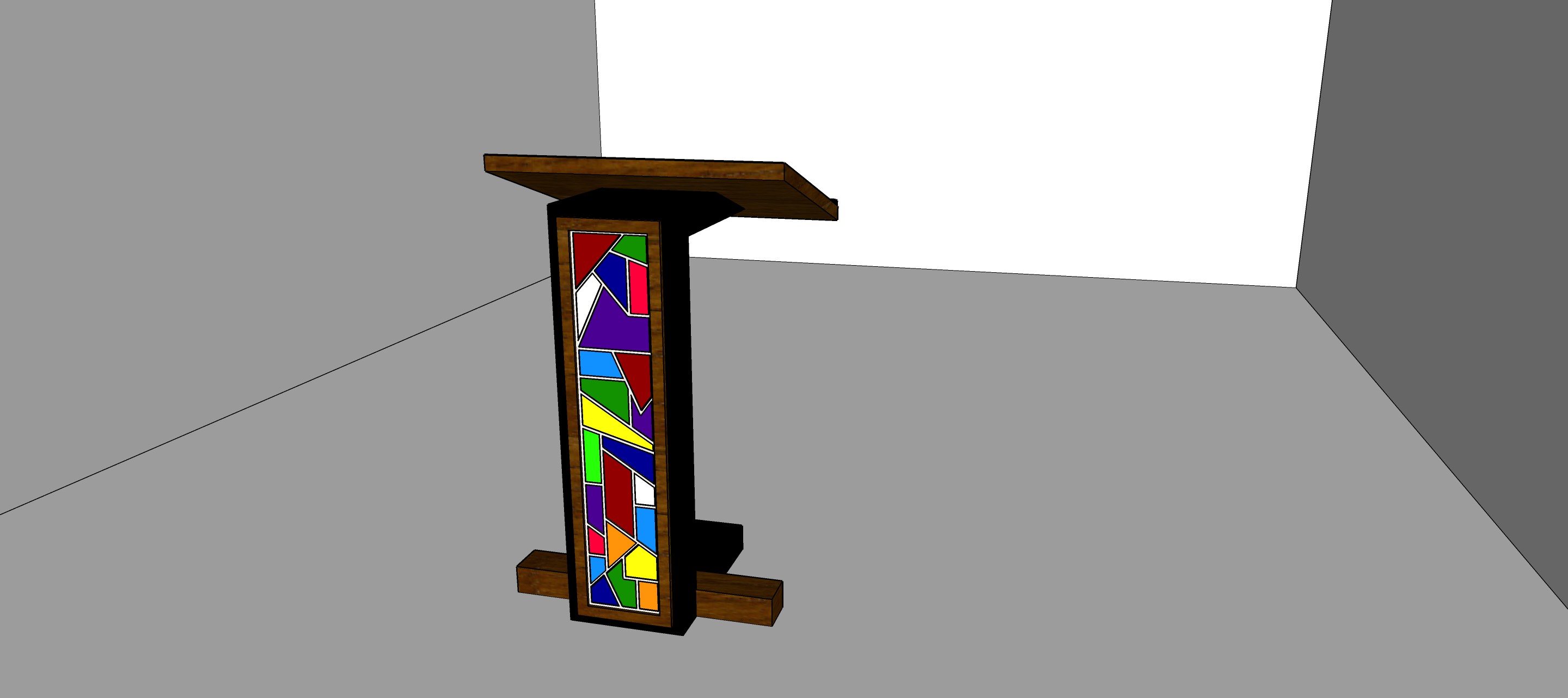 matte black metal frame and body with deep wood picture frame surrounding the backlit stained glass the desk top is the same deep wood tones with the black matte book ledge brighten the room all walls and floors should be white