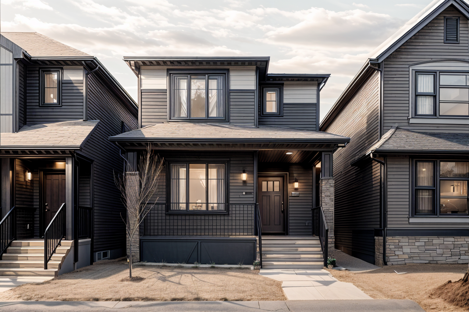 exterior material and color update instructions 1 stone increase the stone coverage around the base of the house to visually anchor it more apply full height eldorado stone casa blanca cladding on the front columns ensure the stone texture looks natural with realistic scale and mortar detailing matching real stonework the color should be light creamy beige white tones consistent with casa blanca 2 siding fiber cement hardie board refinish all siding with a smooth matte dark charcoal gray close to or darker than james hardie iron gray preserve the existing panel profile and visible seams exactly as they are no change to siding style or panel dimensions matte finish with no gloss consistent across all siding surfaces 3 trim window and door surrounds and all other exterior trim paint all trims matte black maintain crisp clean edges and sharp transitions between trim and adjacent surfaces matte black to contrast nicely with dark gray siding but not glossy 4 soffits and fascia replace current soffits and fascia with matte black aluminum include venting details where appropriate for roof ventilation keep clean lines with realistic shadow and light play on the aluminum surface 5 roofing update roof shingles to black architectural asphalt shingles specifically iko cambridge dual black retain granular texture and subtle shadow lines inherent to these shingles ensure realistic lighting interaction on shingles to show depth and surface roughness 6 wood accents horizontal belly bands add natural wood stained horizontal accent bands as transitional elements between siding sections or material changes use warm wood tones like cedar or fir showcasing visible wood grain and texture satin finish with subtle sheen for protection without glossiness detail joinery and shadows realistically where wood meets other materials application notes maintain original architectural forms proportions and construction details apply these material color changes evenly and thoughtfully for balanced composition across the elevation prioritize realism with high fidelity material textures realistic lighting shadow interplay and authentic detailing avoid any color shifts or material type changes beyond those specified