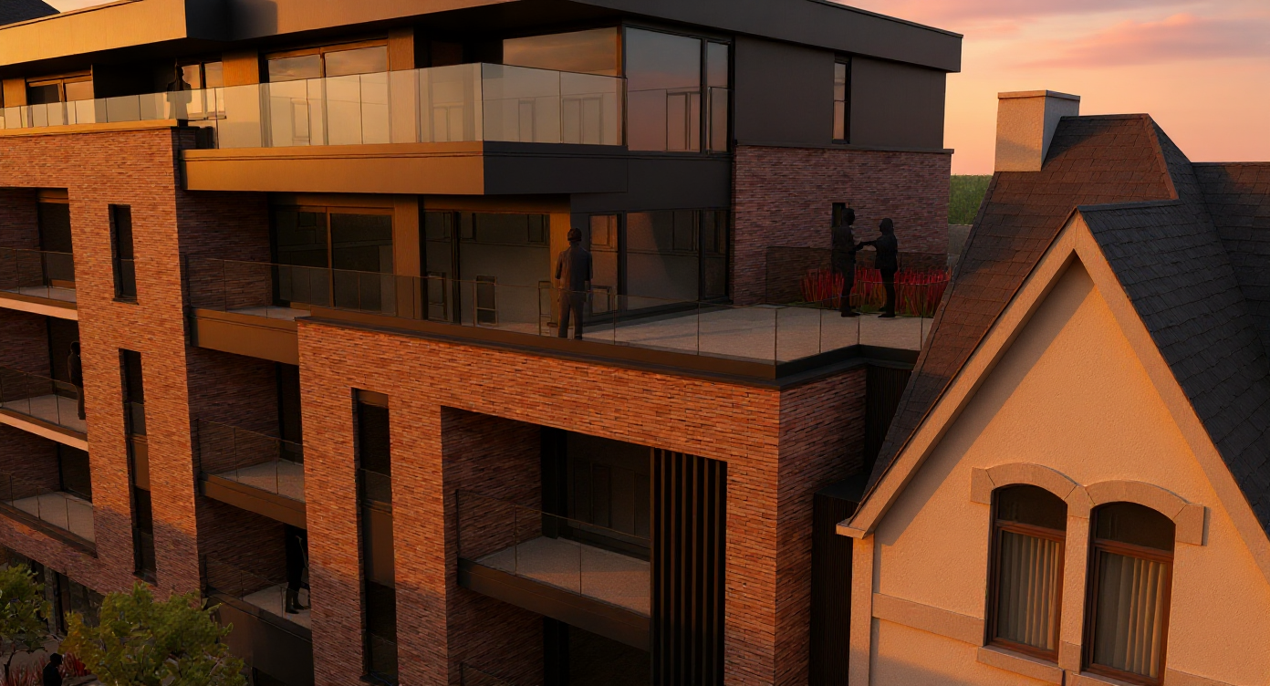 render a beautiful two story house with a beige stone facade and a brown tiled roof the house features large modern windows with white frames the driveway is a muted red brick color surround the house with well manicured green hedges and a small lawn the sky is a clear soft blue atmosphere use realistic lighting to emphasize the textures and colors creating an inviting and harmonious scene the window frame for the house in white colour the window frame from the garage extension in black colour