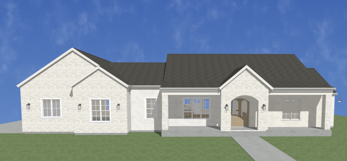 a french country manor with a white creamy brick and a white stucco a manicured lawn with minimal landscaping a light brown double front door a brown charcoal roof pine trees scattered behind the house mountains behind the trees a soft blue sky with white clouds that softens the scene