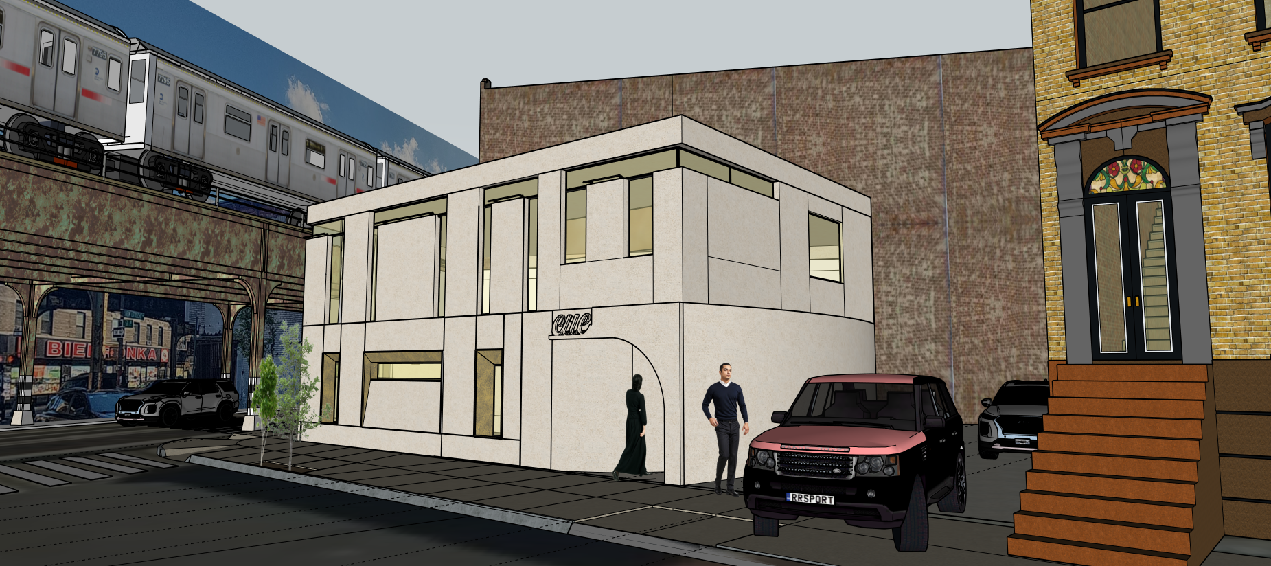 modern two story concrete and glass building on a gritty brooklyn street corner beneath an elevated subway line realistic lighting soft shadows urban textures rusted steel structure above pedestrians and cars in the scene natural daylight around 4 5 pm balanced warm tone cinematic perspective
