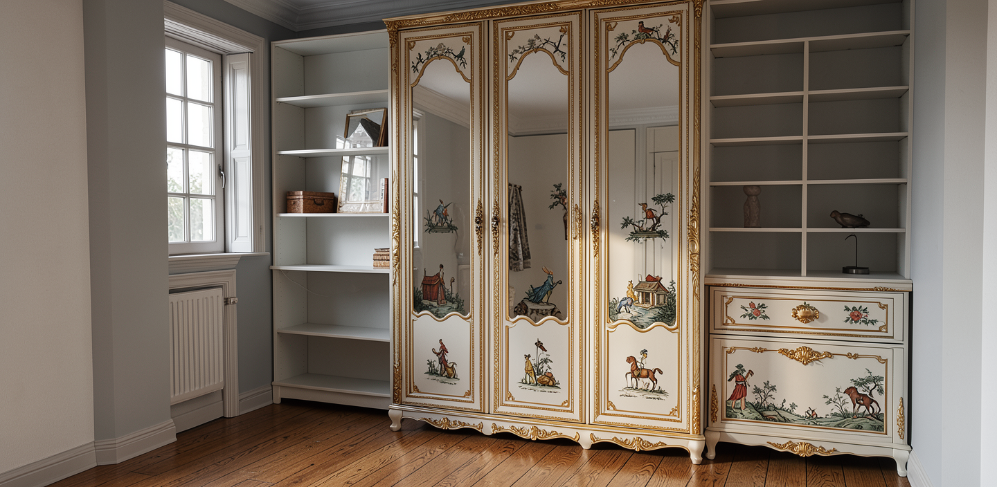 put mirrors on the front of these wardrobes the floor is oak and window is a french style casing cover the shelves with doors