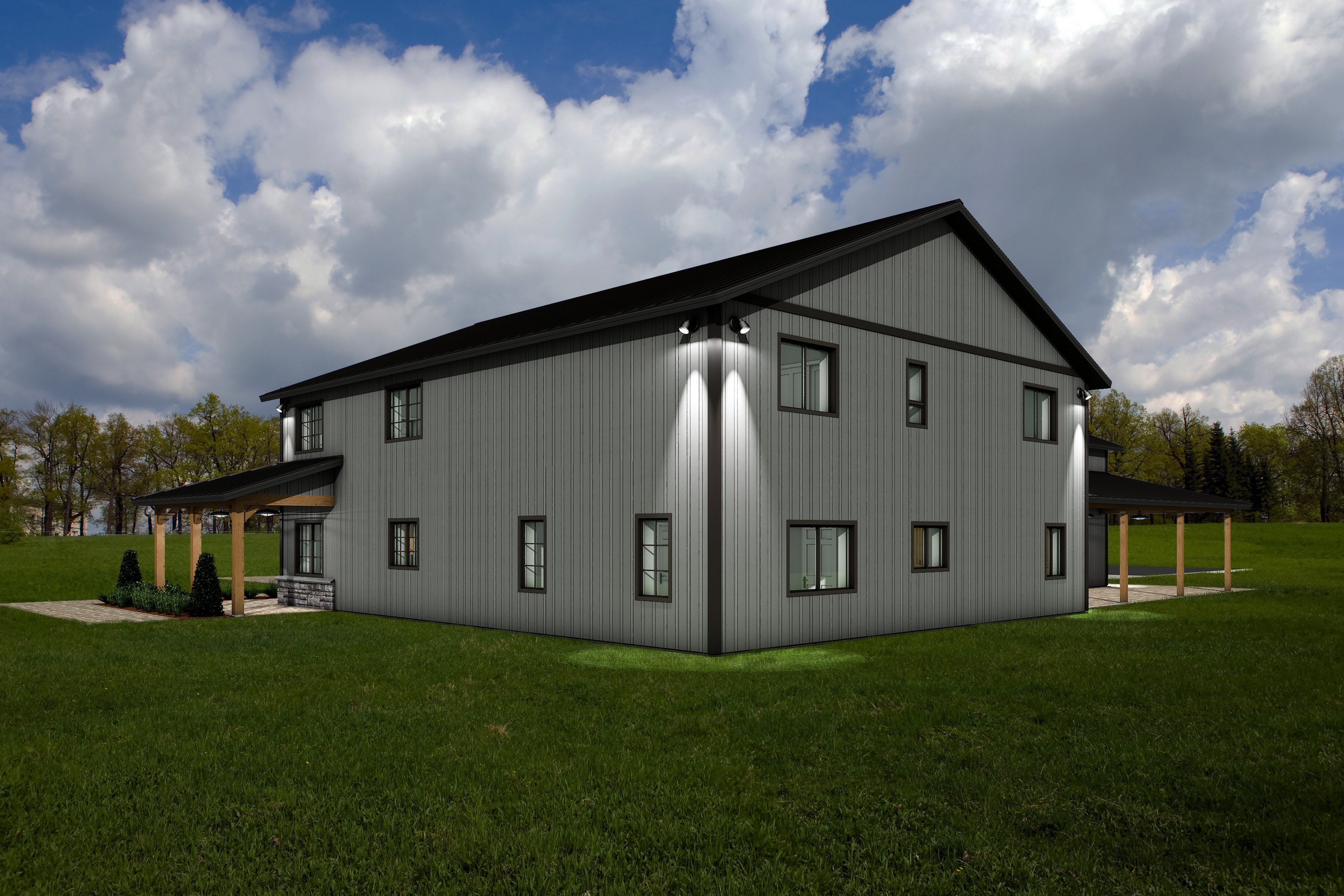 a modern house retain the exact structure colors and window arrangement rooflines siding foundation height railings wood stain colors and proportions exactly as shown in the reference image integrate into the terrain there are very few trees of mixed hardwoods that are mostly on in the distance of the image add cooler diffused afternoon sunlight subtle dappled highlights across the siding and grass create ultra realistic lighting crisp shadows detailed textures in the siding and glass reflections and an overcast sky show only a few lights visible inside render in hyper realistic architectural visualization quality 8k resolution add a driveway tying into the concrete garage door apron make it the fall season add realistic landscape keep the white farm fence in the background