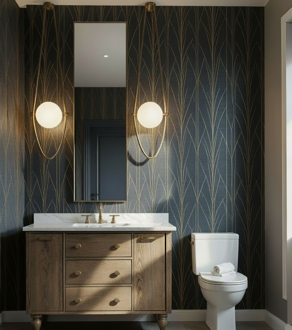change the white ceiling to benjamin moore ebony king change baseboard to benjamin moore ebony king modify the wooden vanity legs to be shorter and thicker creating a stouter more substantial stumpy proportion increase the leg width and reduce the height slightly while maintaining the same style and finish keep edges crisp and geometry clean do not alter the vanity body countertop or surrounding elements do not change the wood tone or material only adjust the leg proportions extend the existing wallpaper from the back wall onto the adjacent right wall the right wall must be fully covered in the exact same wallpaper same pattern scale color and orientation continue the pattern seamlessly through the corner with proper alignment do not leave the right wall plain or painted do not substitute or reinterpret the material preserve all existing geometry lighting and details apply this change only to the right wall