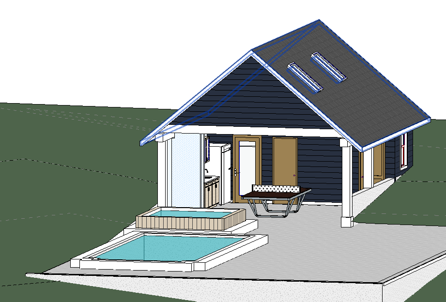 make look realistic add furniture add landscaping the building is surrounded by a tall hedge with no stairs the ground behind the building is 5 feet taller than the patio there is a built in shower on the left hand side
