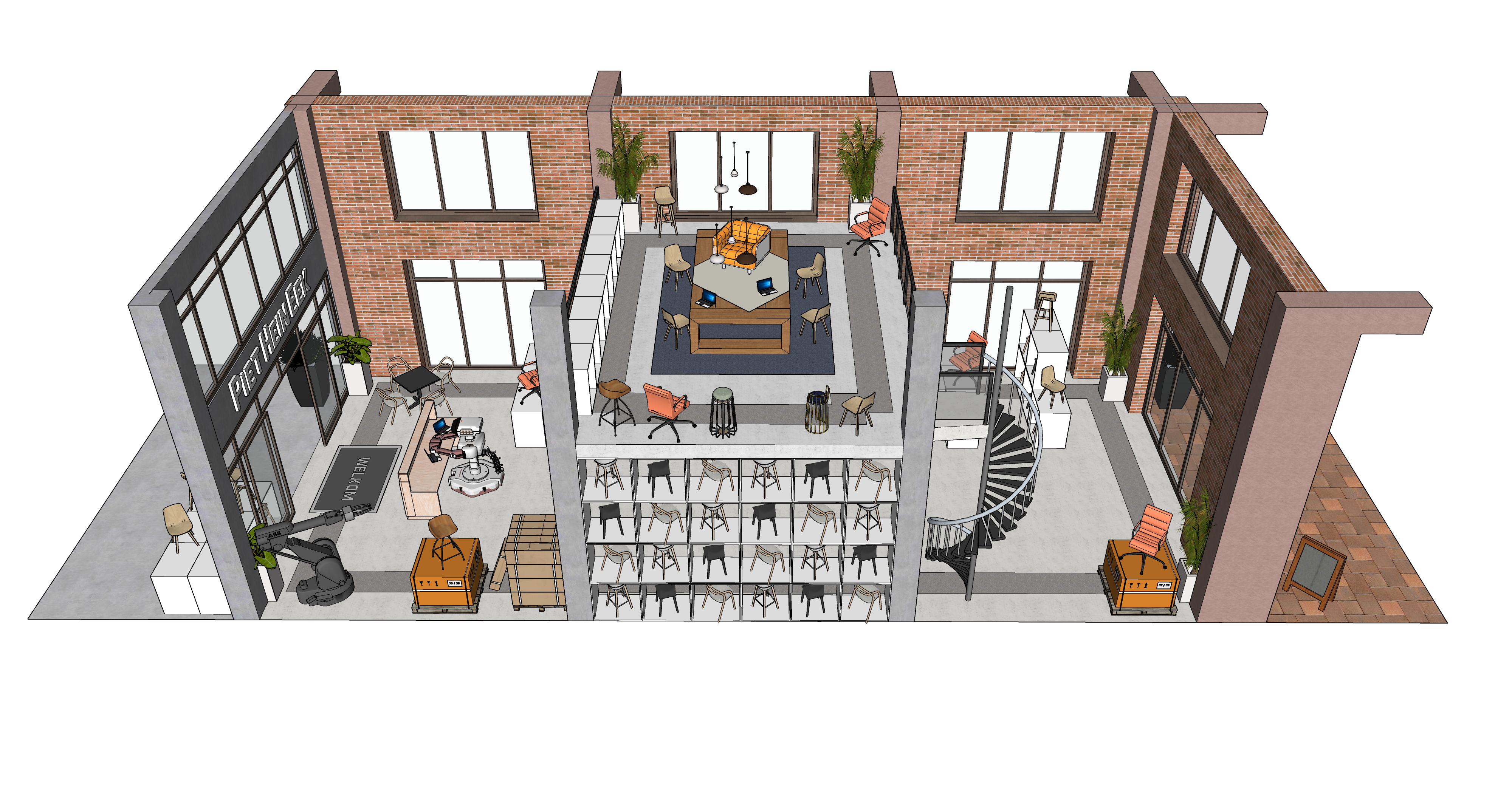 modernist aerial shot modern coworking makerspace high end furniture workshop warm morning light ambience light tones wooden details architecture