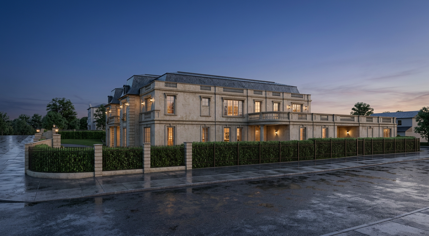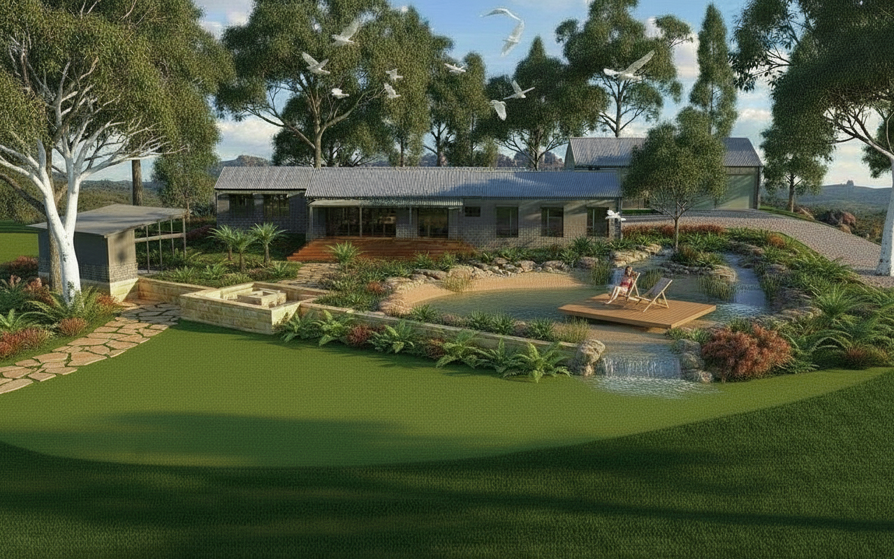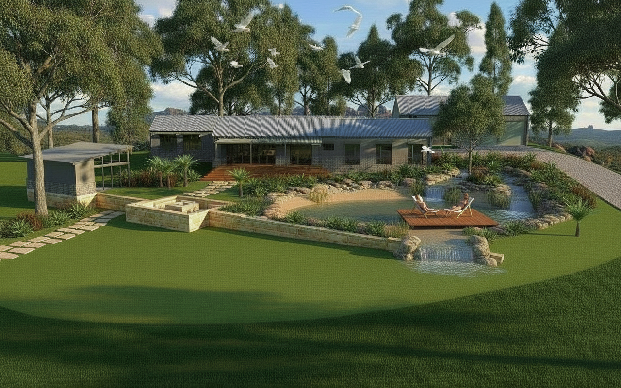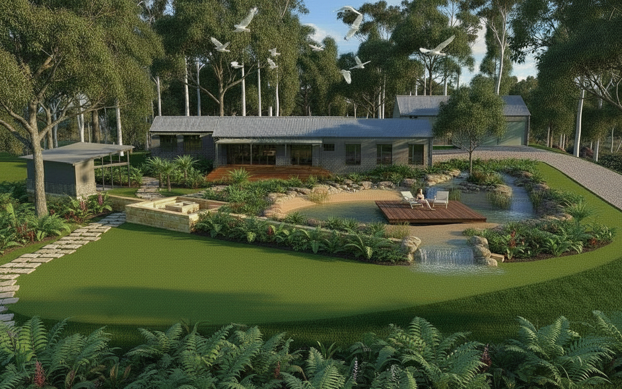this is an elevation of a house locate it in a sydney suburb in a blue sky setting do not change the type of external house finishes do not add new elements to the house make it photo realistic by adding shadows use white and grey for house colours add furniture and lighting behind windows white painted walls dark roof black window frames black entry doors do not change anything do not flip the photo