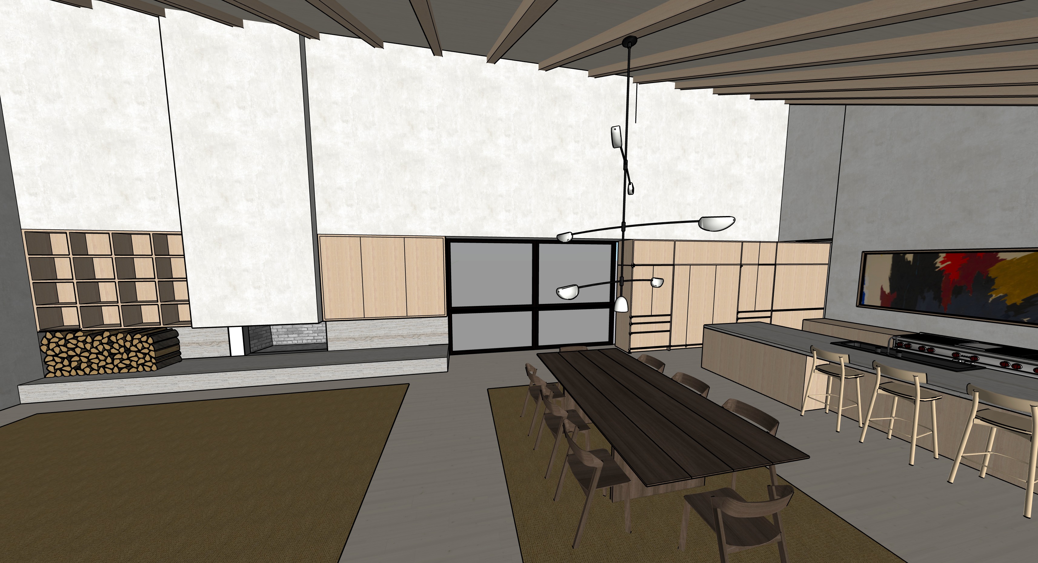 modern serene living room and kitchen with a shed roof applied natural stained white oak beams applied natural stain fir ceiling planks and a white oak cabinets bookcase firewood holder kitchen cabinets with integrated drawer pulls as shown and a stainless steel countertop as shown the floor is natural stain fir planks walls are a cream plaster fireplace hearth is a natural stone light fixture as shown in burnished nickel