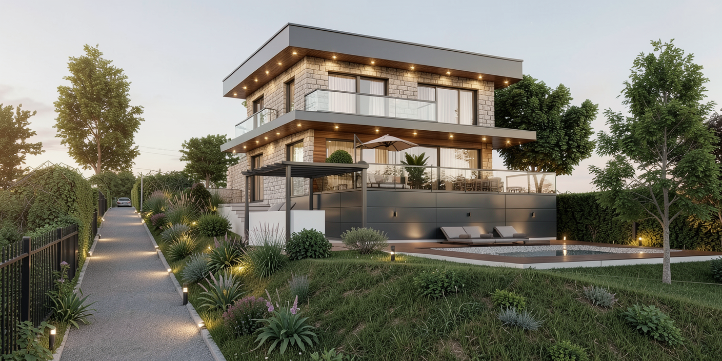 photo real rendering house paint sherwin williams snowbound black shingle roof front door is sherwin williams color naval gray paver driveway and walkway lush florida landscaping on a bright sunny day