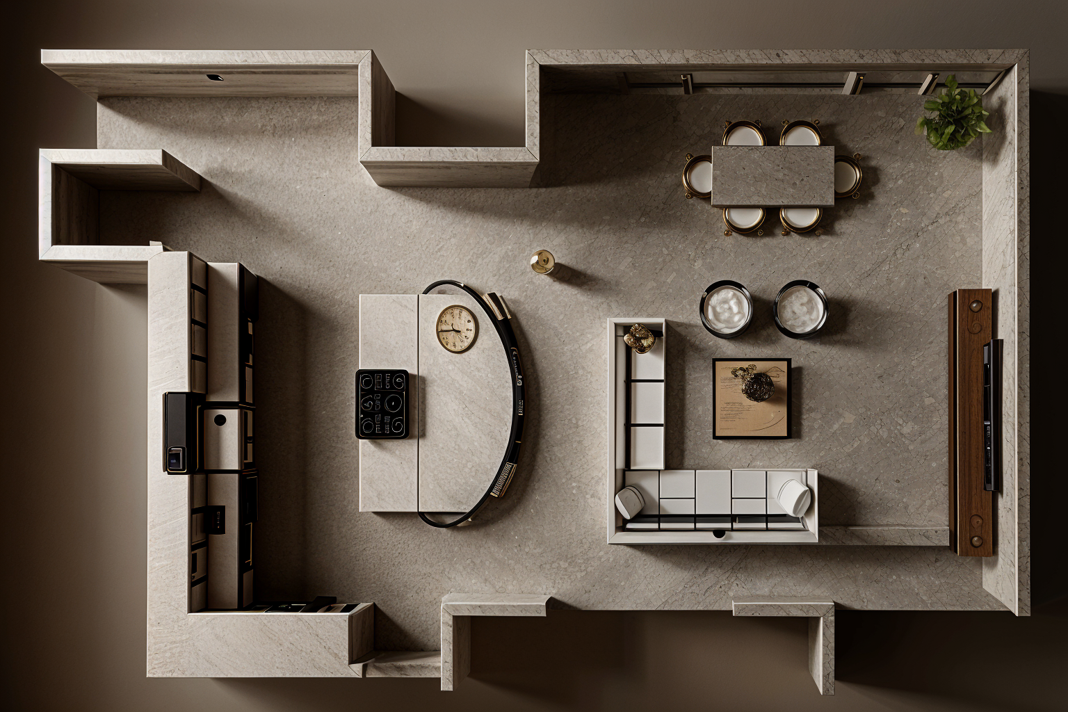the flooring is 2 honey colored oak the countertops are taj mahal quartzite render as in the original drawing please