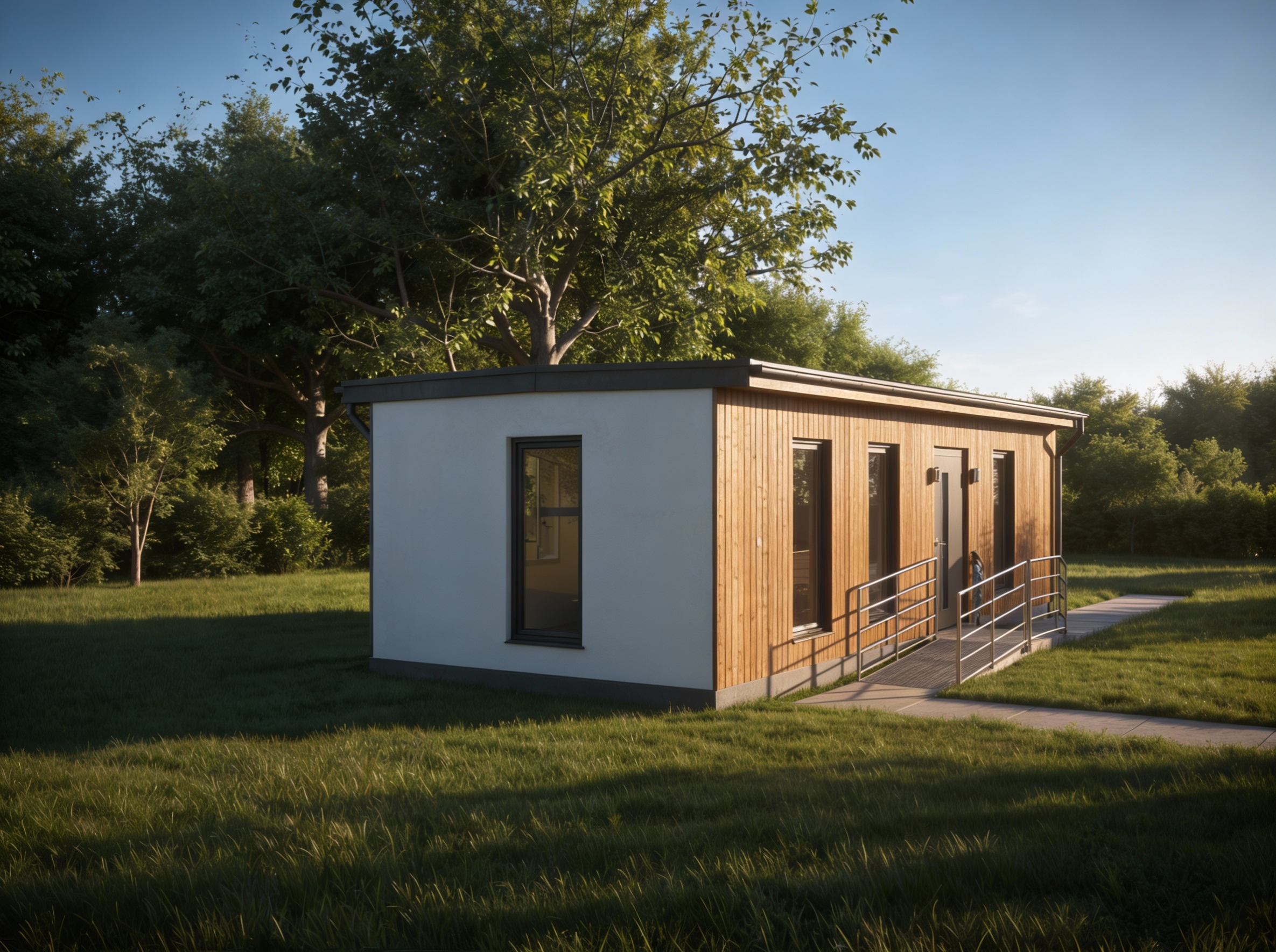 please make a realistic render with warm modern tones and black window frames set in a residential neighborhood with some large mature trees in the background material showing natural brick limestone and stucco show contemporary accents