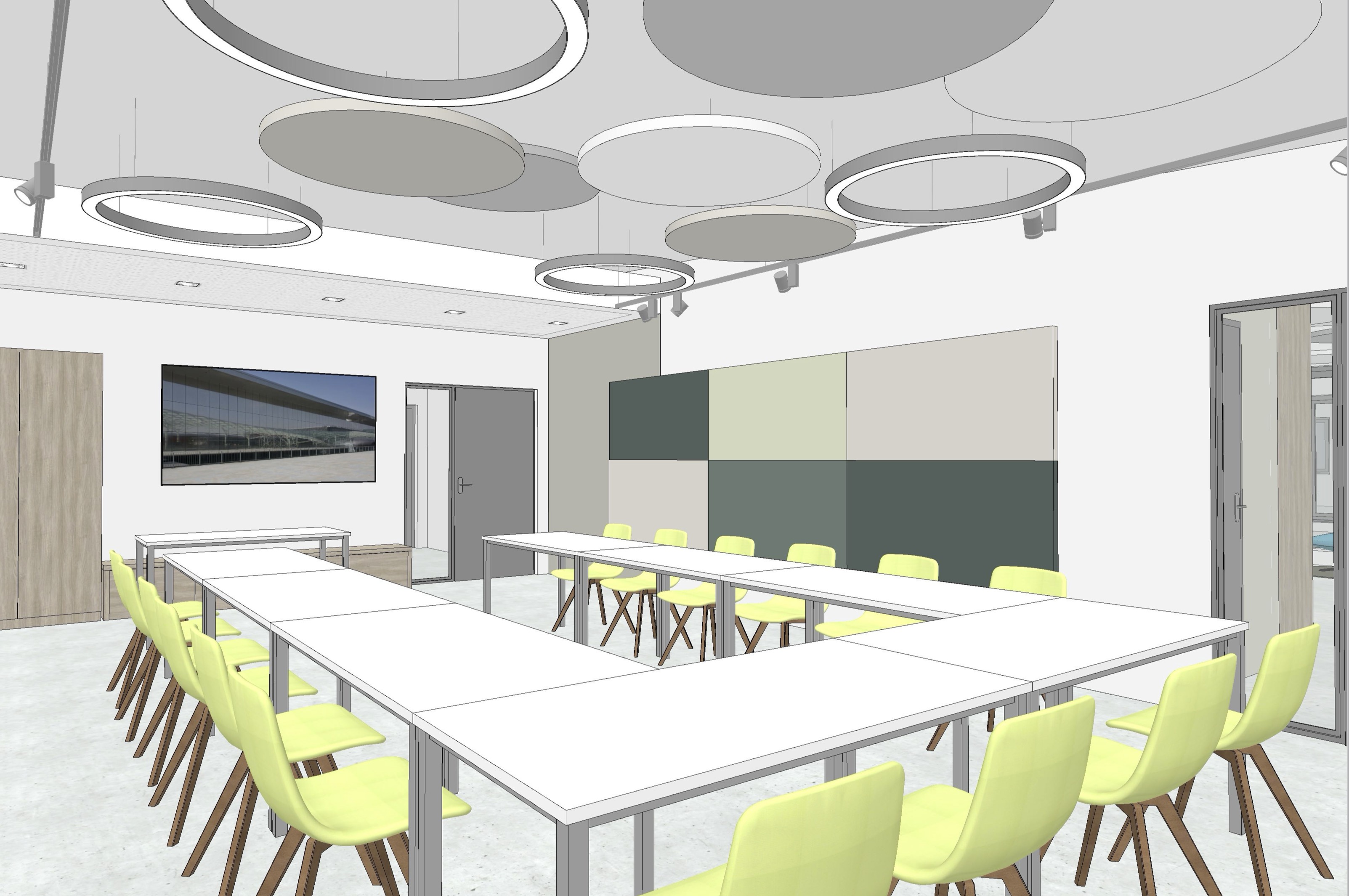 use the provided cad perspective strictly as the sole geometric and compositional reference preserve all elements exactly as given including proportions layout camera position field of view and object placement do not add remove reinterpret or redesign any architectural or interior elements no new objects furniture or light sources may be introduced under any circumstances all visible text within the image must be preserved exactly as shown do not alter reinterpret stylize translate or replace any text typography spelling layout and positioning must remain 100 identical to the original enhance the image exclusively through photorealistic rendering quality apply realistic materiality to all surfaces based on their implied function and construction maintaining the original design intent surfaces should exhibit subtle physical properties such as texture depth light absorption soft reflections and where appropriate controlled specular highlights or mirror effects avoid exaggerated or stylized materials aim for believable natural realism lighting introduce natural daylight entering the space in a plausible and context appropriate way the daylight should appear realistic and balanced without being limited to overcast conditions detect and utilize all light fixtures that are present in the original cad image these must visibly emit light and contribute to the overall illumination of the scene artificial lighting should produce realistic light falloff gentle highlights and nuanced shadow transitions do not add or invent any additional light sources beyond those already visible in the image the final image should read as a faithful photorealistic translation of the original cad perspective not as a reinterpretation add people on every chair around the tables who are listening to a standing speaker