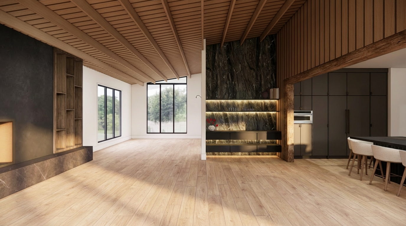 add dark grey marble at the hearth only keep it sunken keep the brick that is in the image dark brown wood floors all white walls tv above fireplace with applied moldings around tv to match the mantle revive all objects and wires