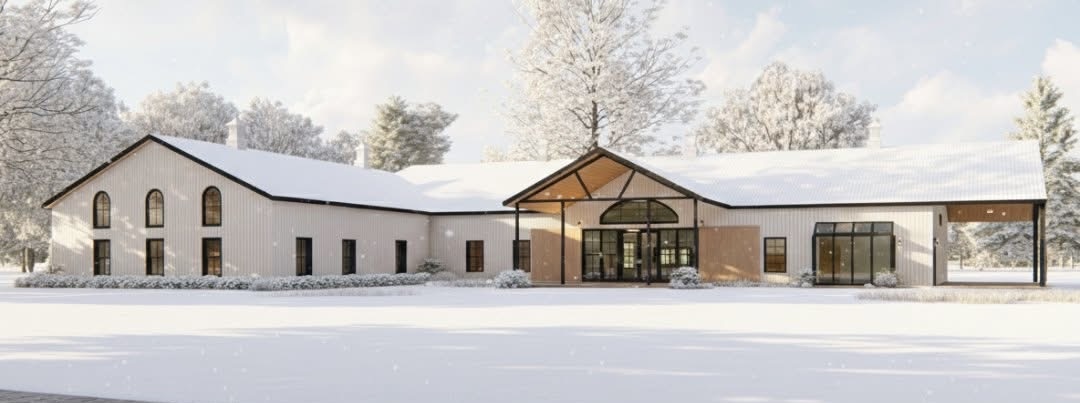 render a modern spacious building beautifully nestled in a serene winter landscape the structure features large arched windows and a high wooden entrance with exterior walls in soft cream and contrasting dark outlines the roof is blanketed with fresh bright white snow under a clear blue sky surround the building with snow draped trees in shades of white and gray glistening under the soft golden sunlight the atmosphere is tranquil and inviting with a touch of warmth from the sunlight illuminating the scene