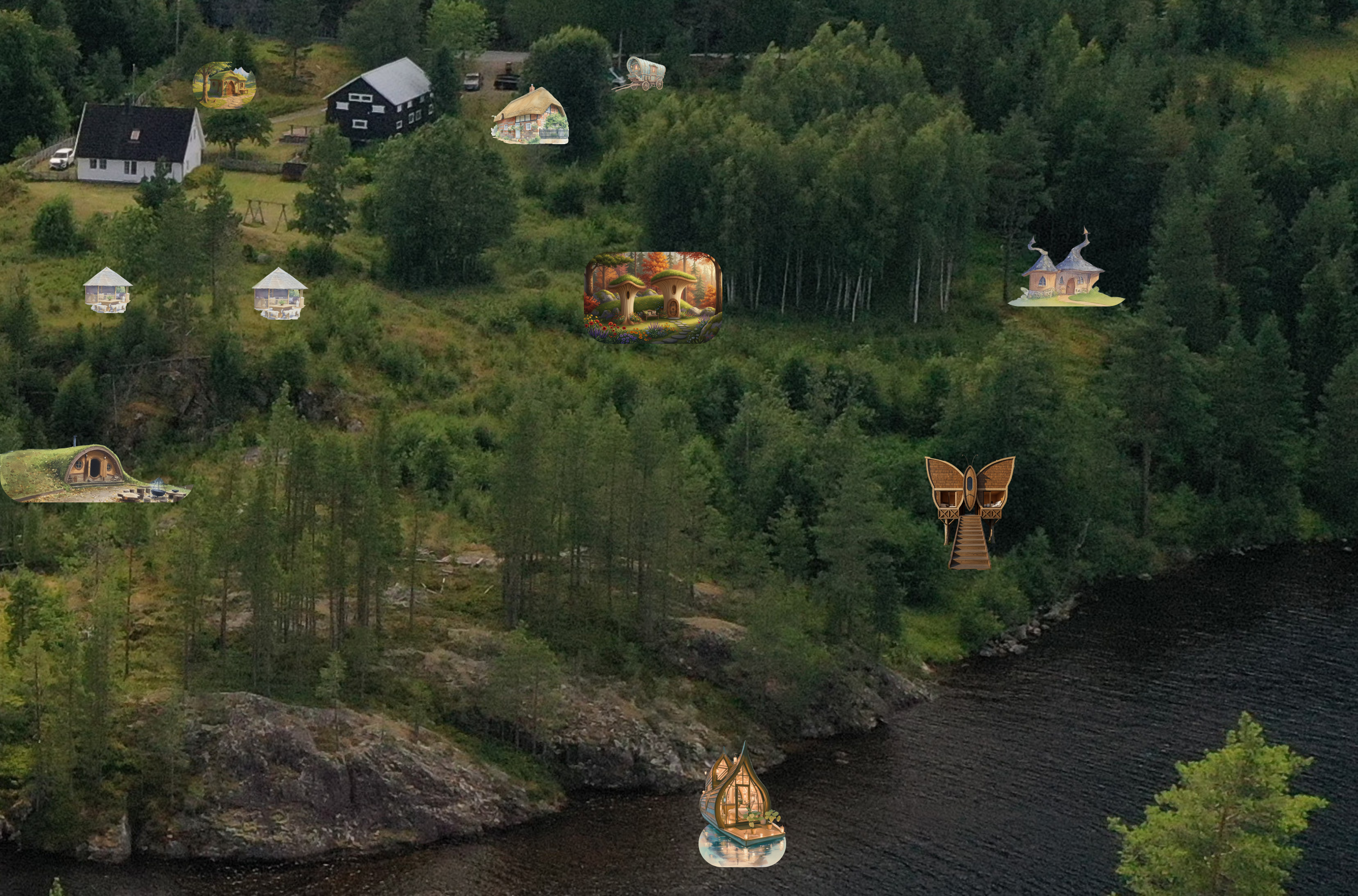aerial shot transform the mockup of imaginary houses in the landscape into an architectural ready image overview of a fairy tale like world keep the landscape as realistic and similar as possible but make the houses and structures look like they belong there add small gravel paths between the houses so that it all looks like an aerial map over the fairy tale landscape